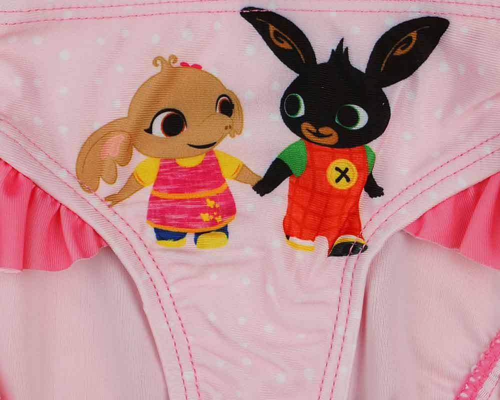 Bing nyuszi mintával nyomott, fodros kislány fürdőbugyi.