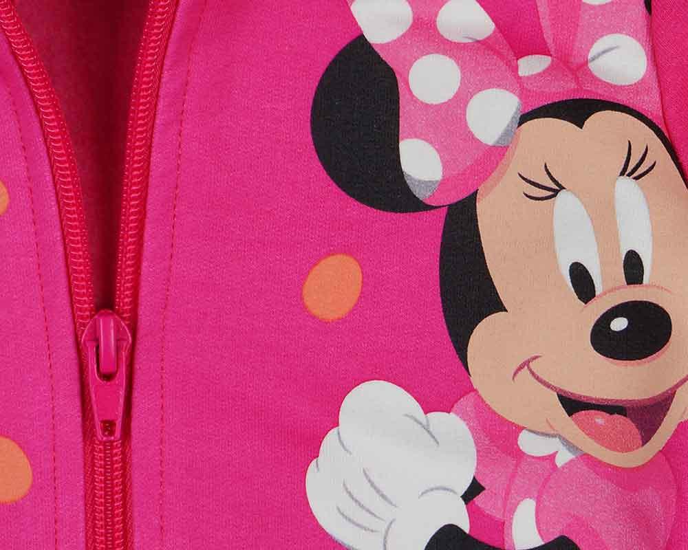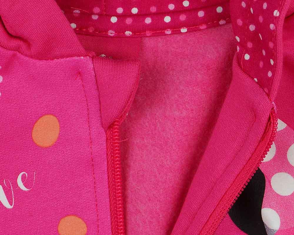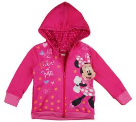 Minnie egér mintával nyomott, belül bolyhos, oldalt zsebes, kapucnis, elöl cipzáras kislány kardigán.
