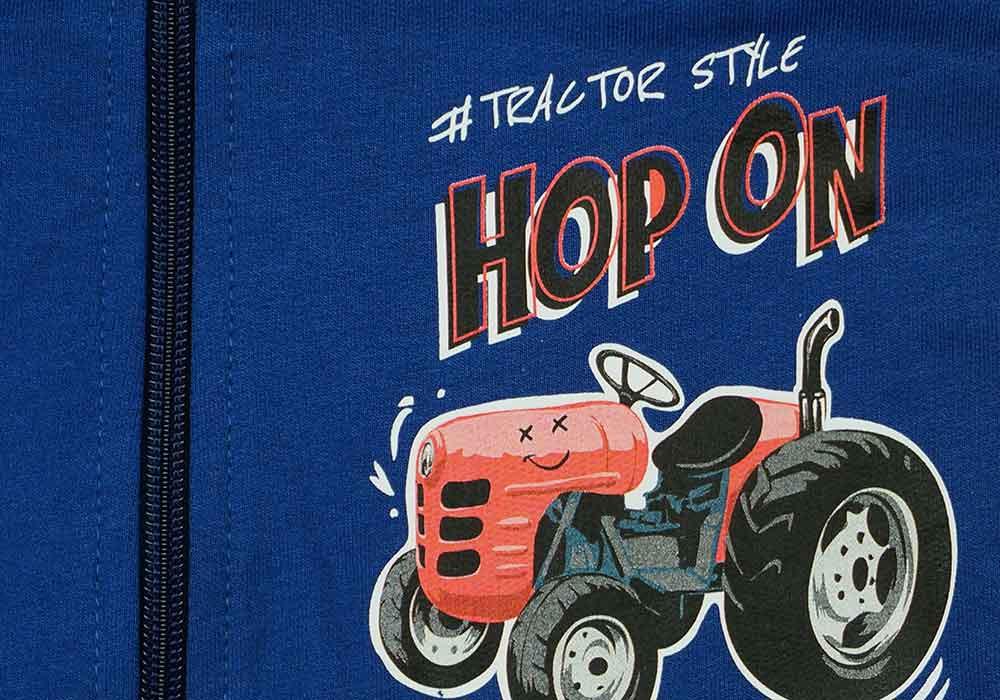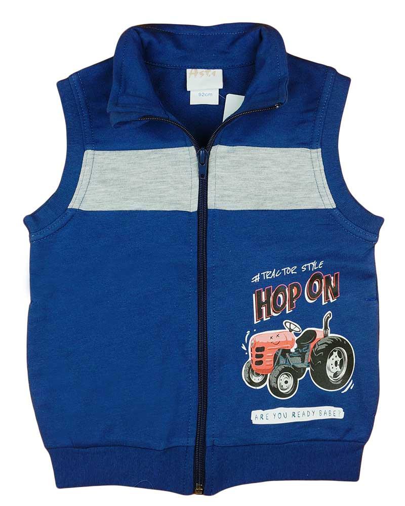 Traktoros mintával nyomott, oldalt zsebes, elöl cipzáras kisfiú pamut mellény.