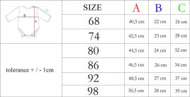 Az öltöztetést és a pelenkacserét megkönnyítik a vállon és a lábak között praktikusan összekapcsolható patentek. A body fontos ruhadarab a babák számára, ugyanis a baba bármennyit mozoghat, a háta mindig takarva lesz.