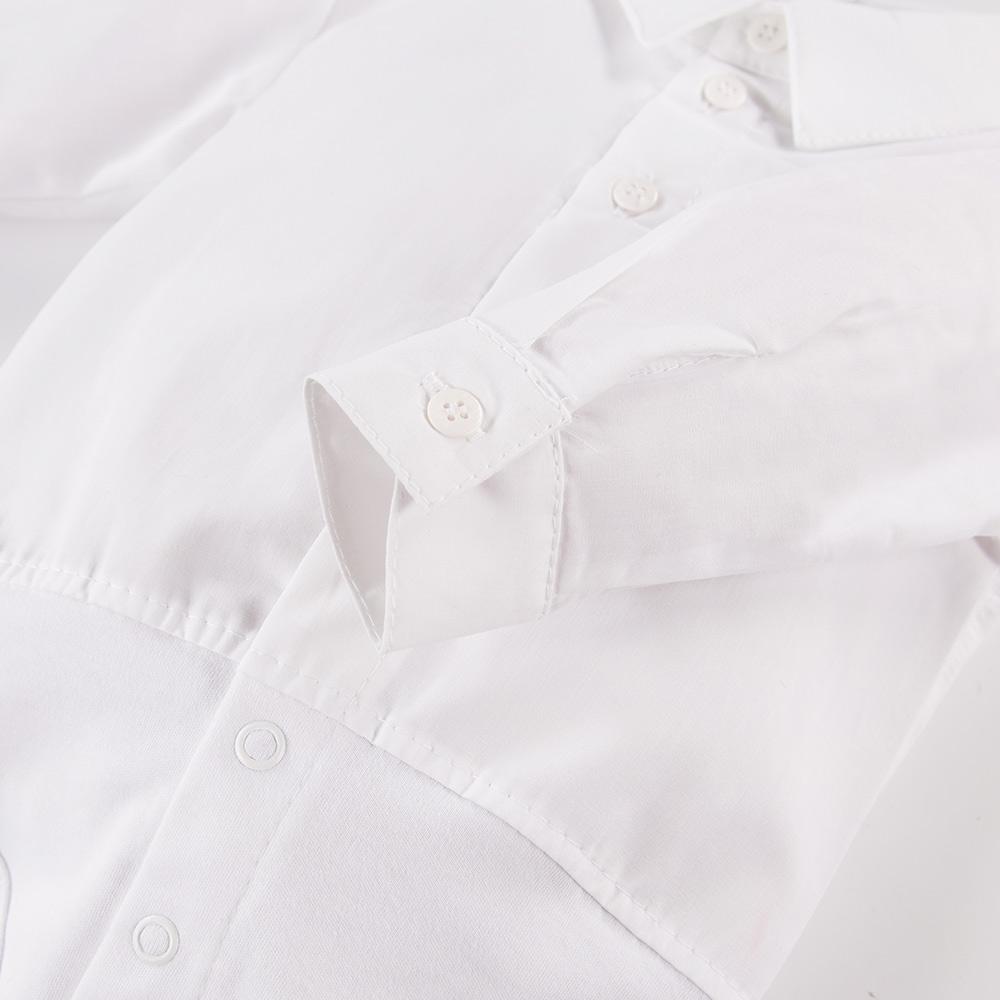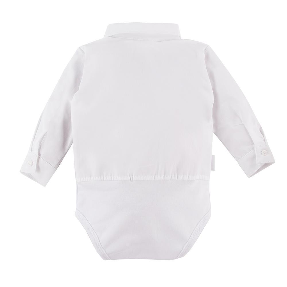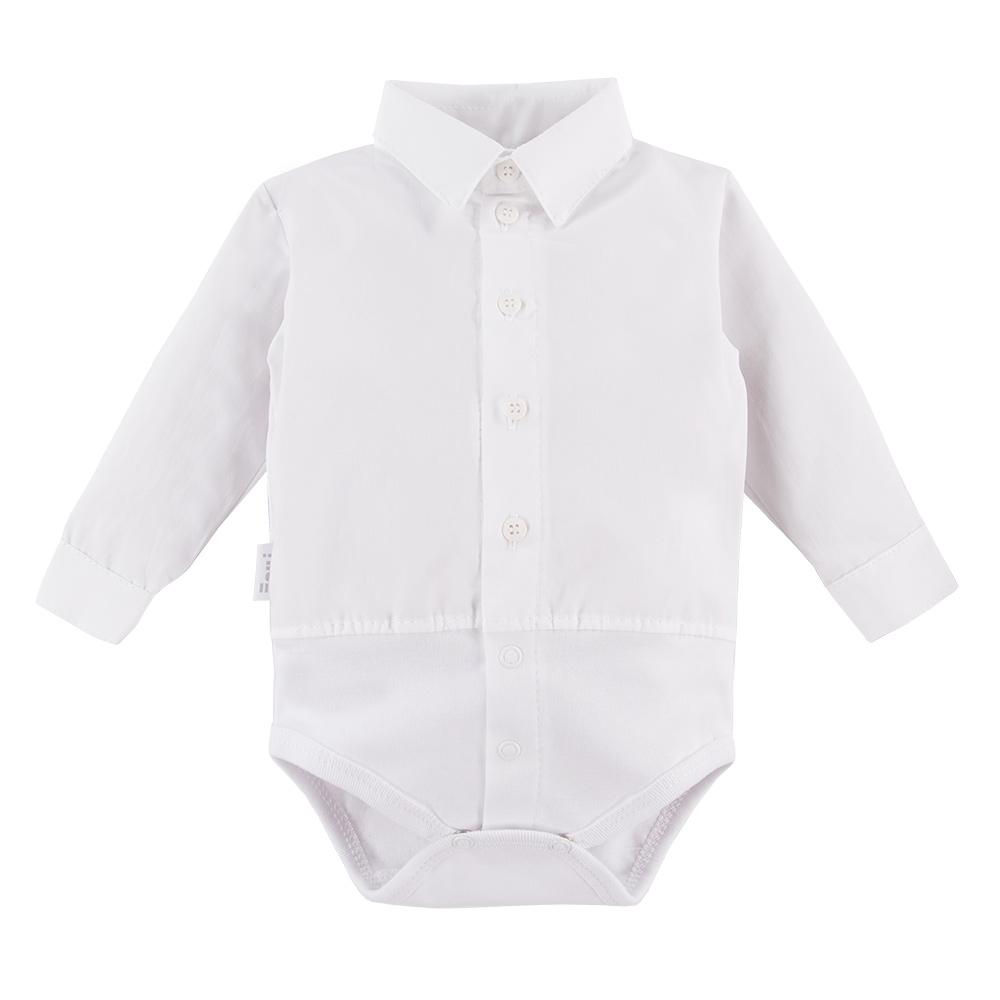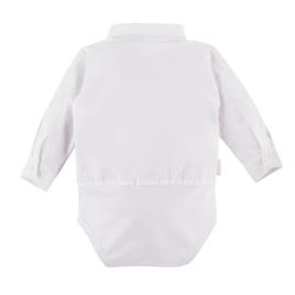 Fedezd fel az Eevi Ceremony kollekció kisfiúknak tervezett ing fazonú bodyját! A hosszú ujjú body felső része ing stílusú, elöl végig gombokkal elátott, ami elegáns megjelenést kölcsönös a kisfiúknak. A body alsó része rugalmasabb, puha pamut anyagból készül a kicsik legnagyobb kényelméért. A body az ülepénél patentos, így a pelenkacsere és az öltöztetés egyszerű. A praktikus patentok és gombok egyszerűsítik az öltöztetést.