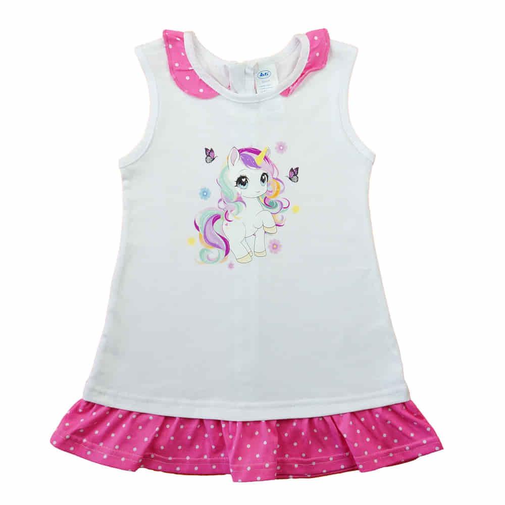 Ez a könnyed, ujjatlan kislány ruha igazi nyári kedvenc lesz! Vidám színvilága és bájos mintája azonnal elnyeri a gyerekek és a szülők tetszését is, míg a vékony, 100% pamut anyag kellemes viseletet biztosít a legmelegebb napokon is.
