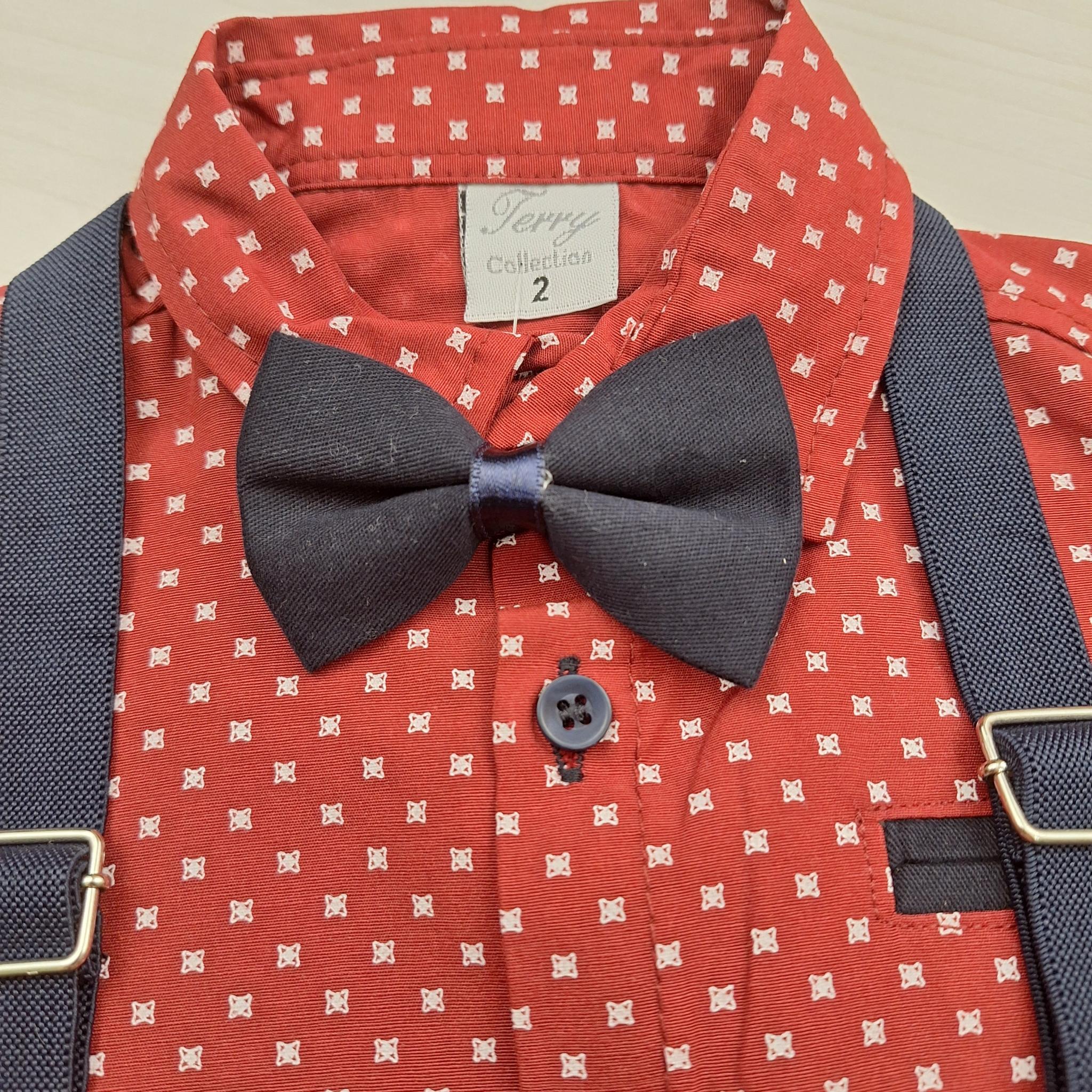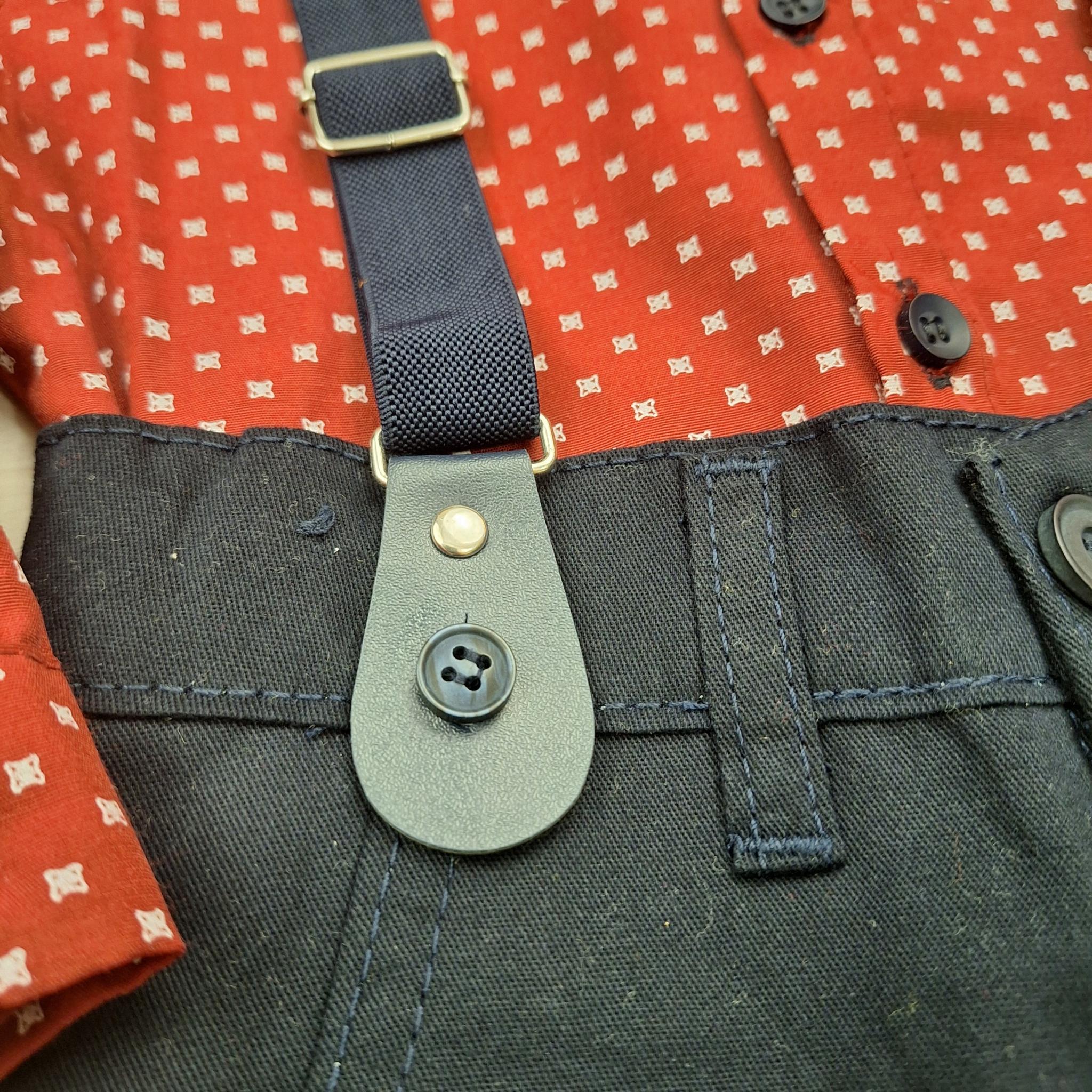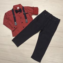 A sötétkék nadrágtartó és a csokornyakkendő teszi teljessé az ünnepi megjelenést. Ettől lesz ez a szett igazi kis úriemberi viselet.