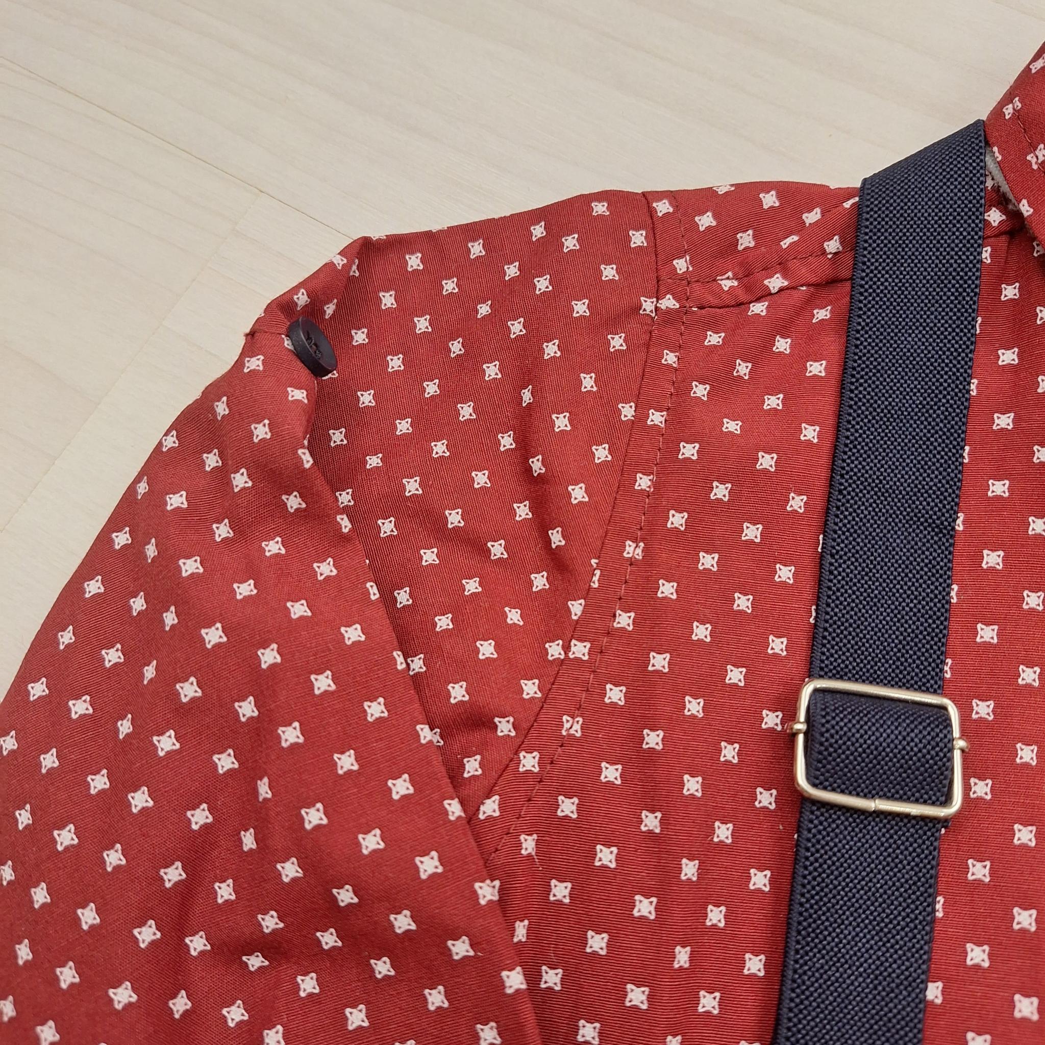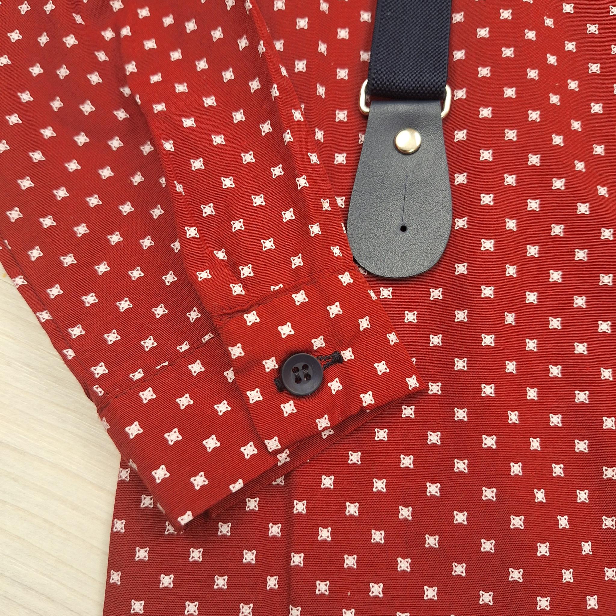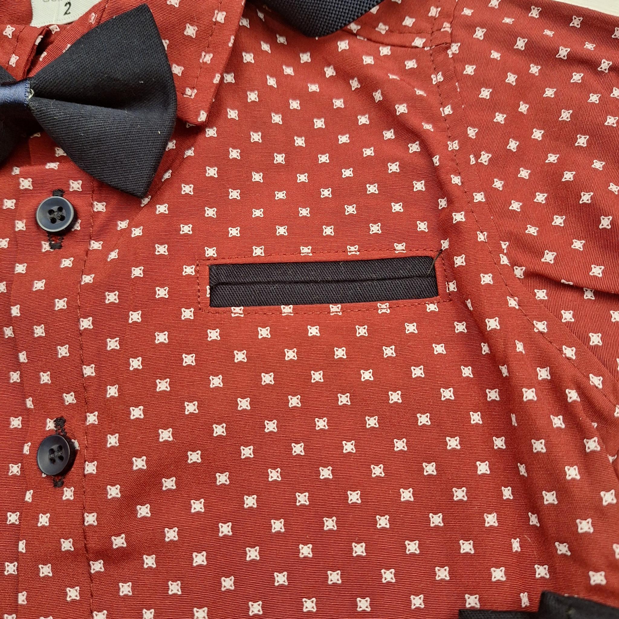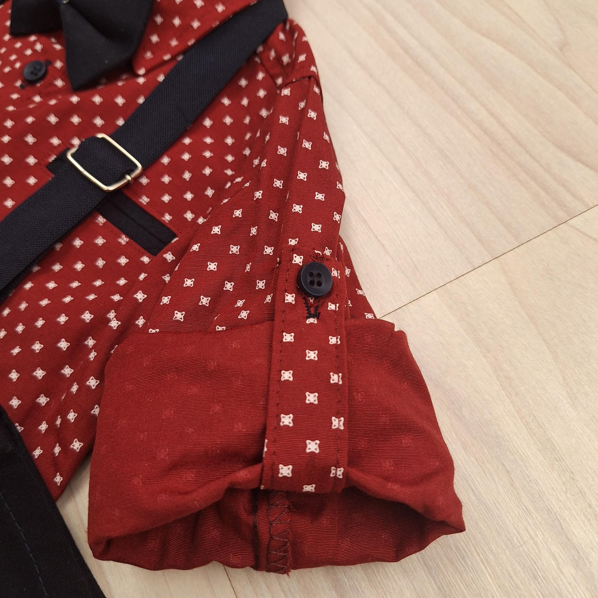 A szett tartalmaz egy hosszú ujjú bordó inget, amely finom fehér mintájával és díszzsebével eleganciát sugároz. Az ujjak felgombolhatók, így az ing akár rövidujjúként is viselhető. Anyaga 65% pamut és 35% poliészter, ezért kellemes tapintású, jól szellőzik, és könnyen vasalható.