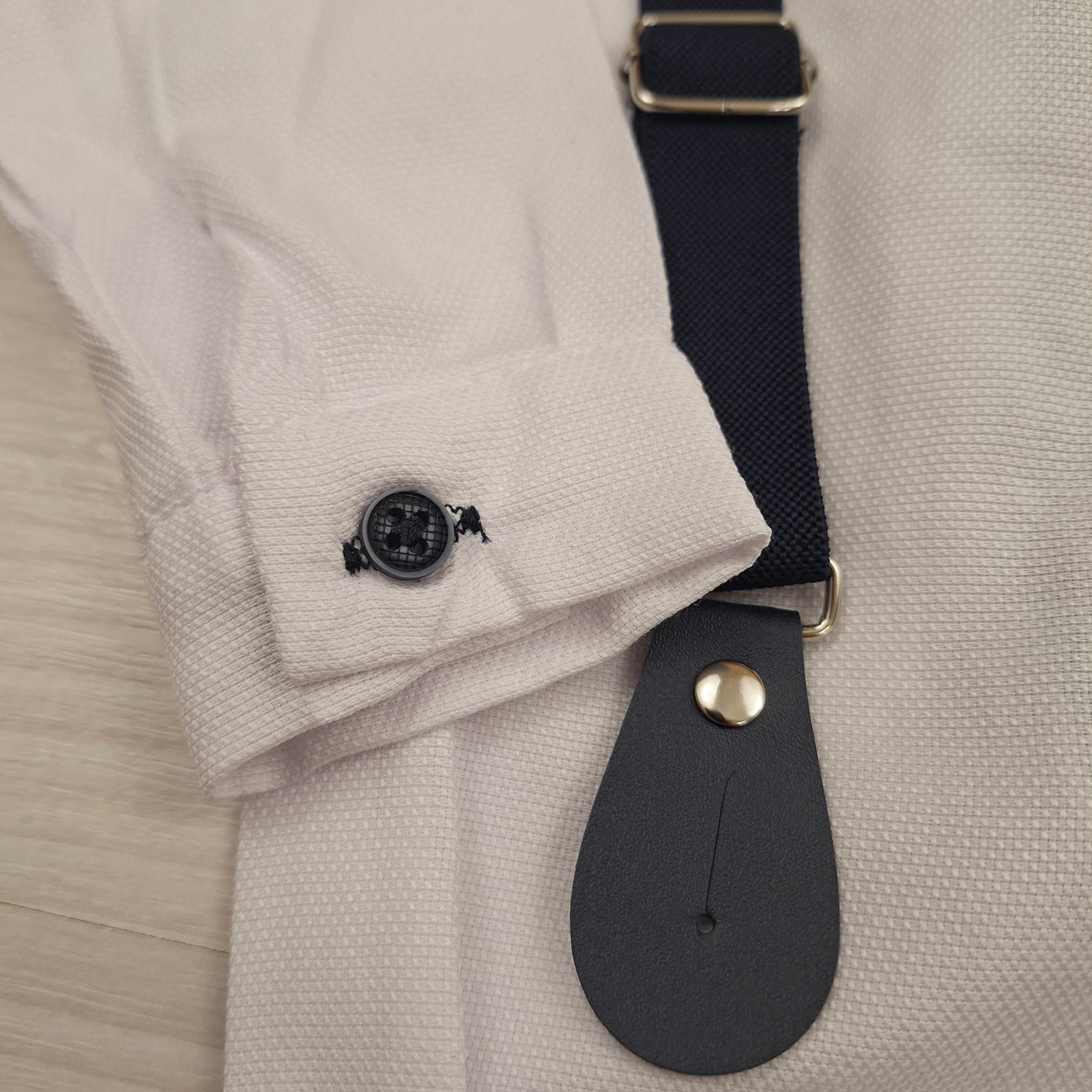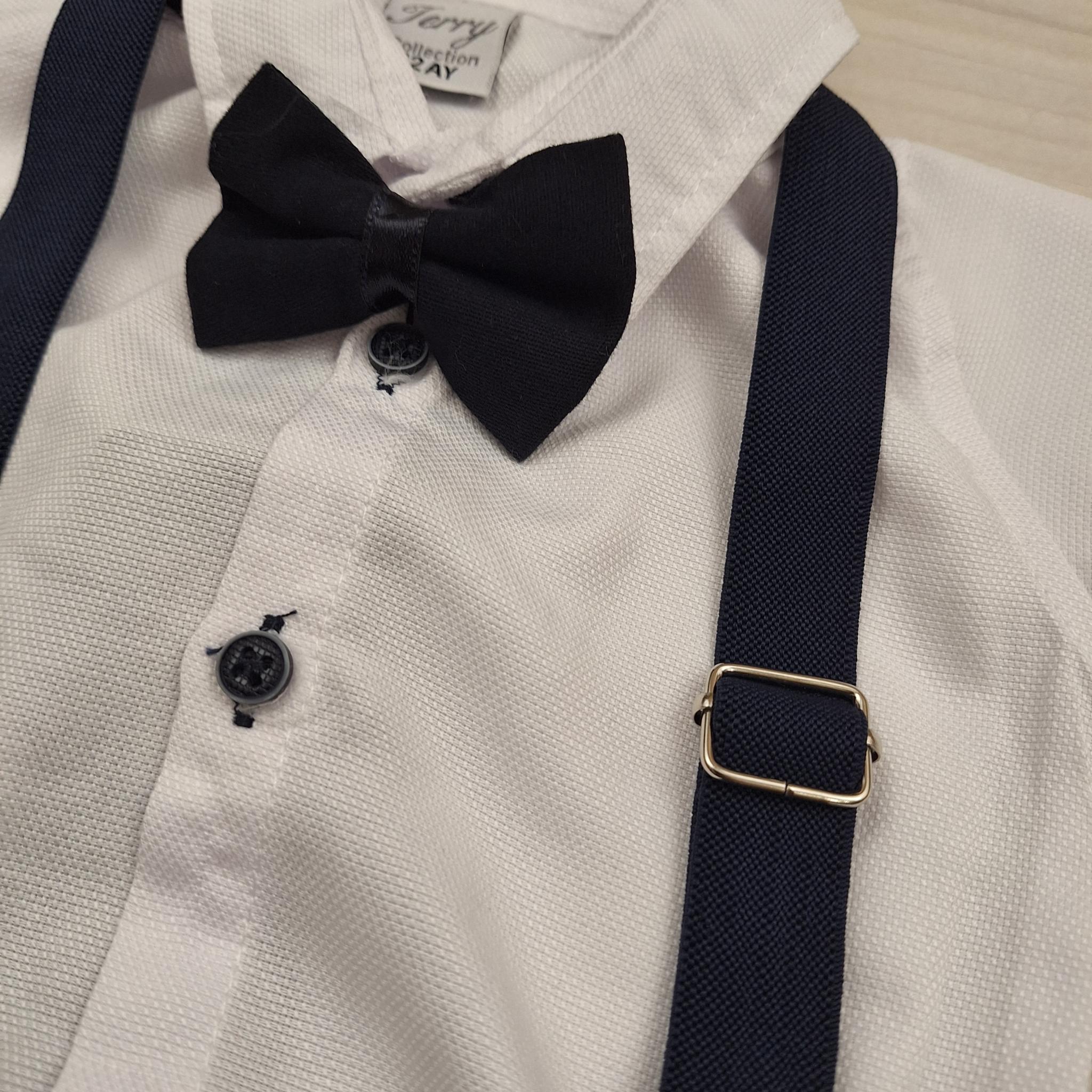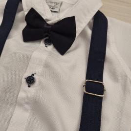 A sötétkék nadrágtartó és a csokornyakkendő teszi teljessé ezt a bájos, kisfiús alkalmi szettet. Ettől válik igazán ünnepivé és fotózásra is tökéletessé.