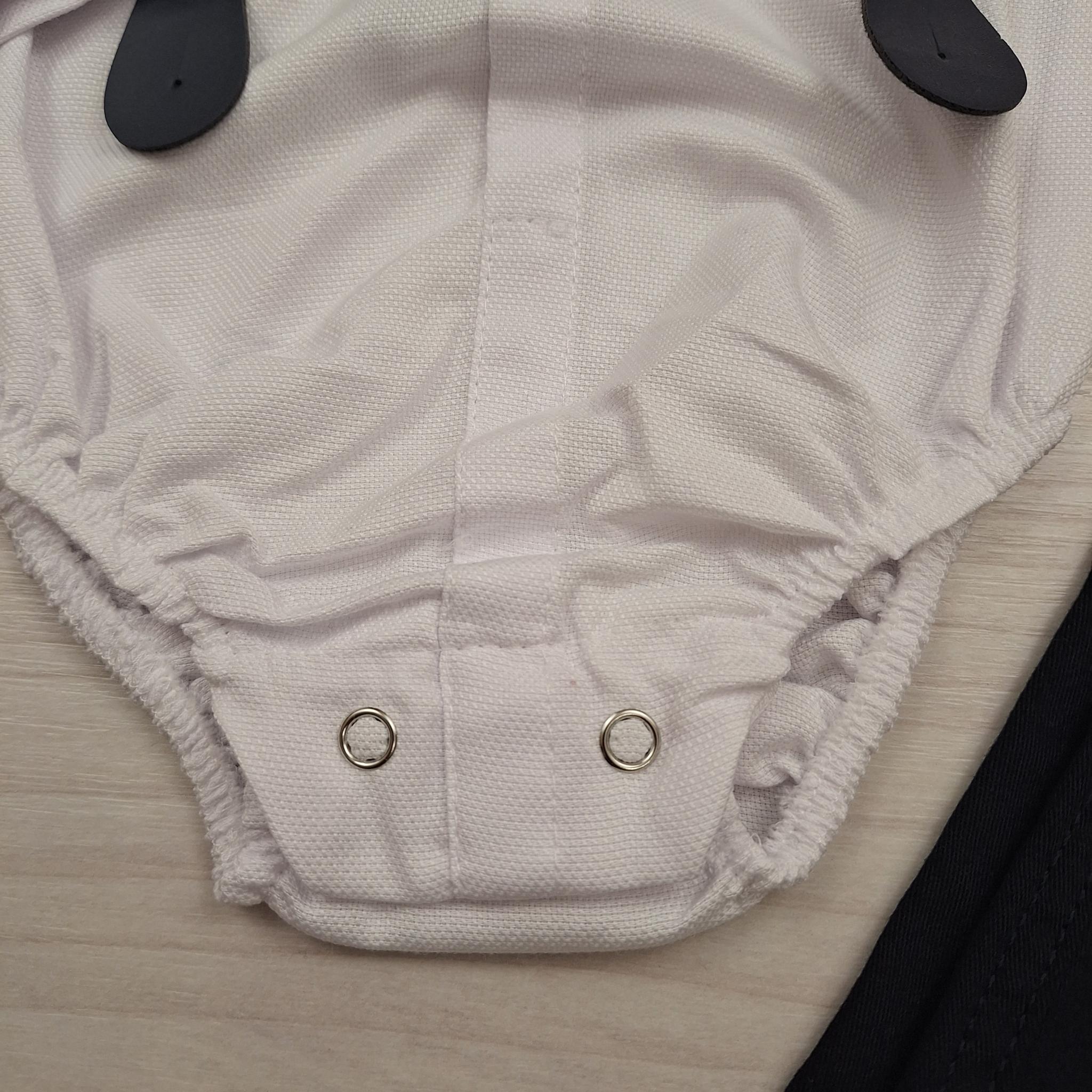 A szett lelke egy fehér, galléros baba body, amely elöl gombos kialakítású. Az ülepénél patentos záródással készült a könnyebb öltöztetés érdekében. Külön figyelmesség, hogy a body lábrészénél gumírozott szegély gondoskodik a kényelmes illeszkedésről.
