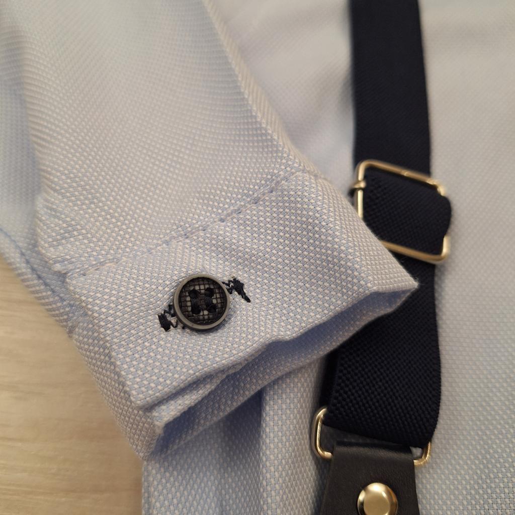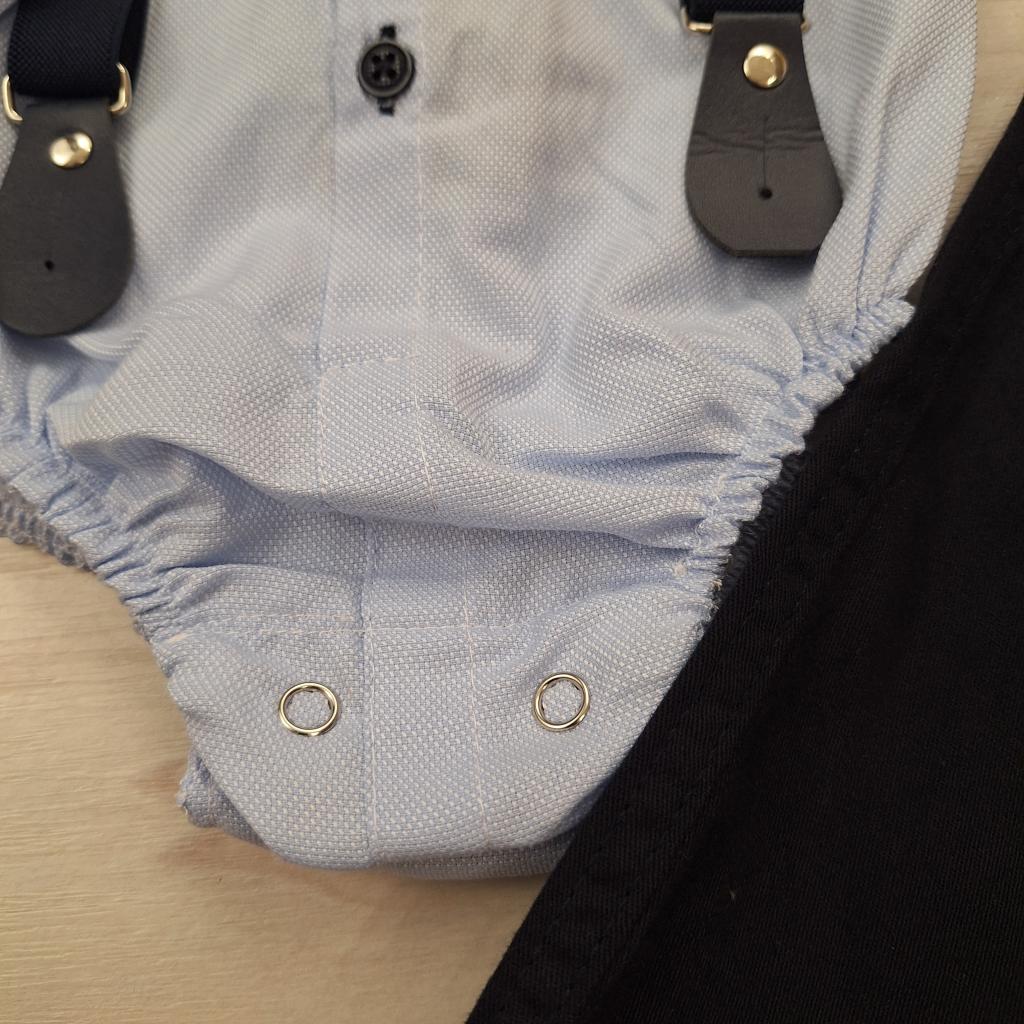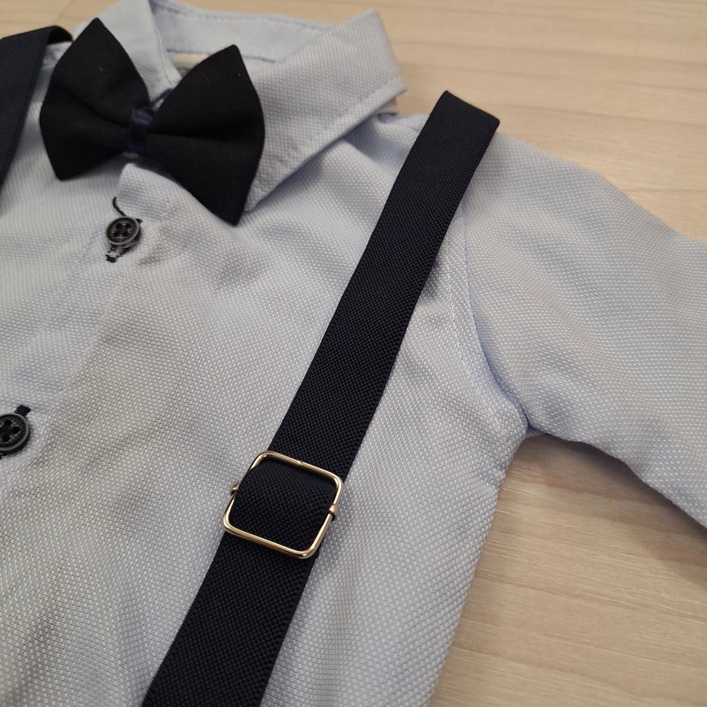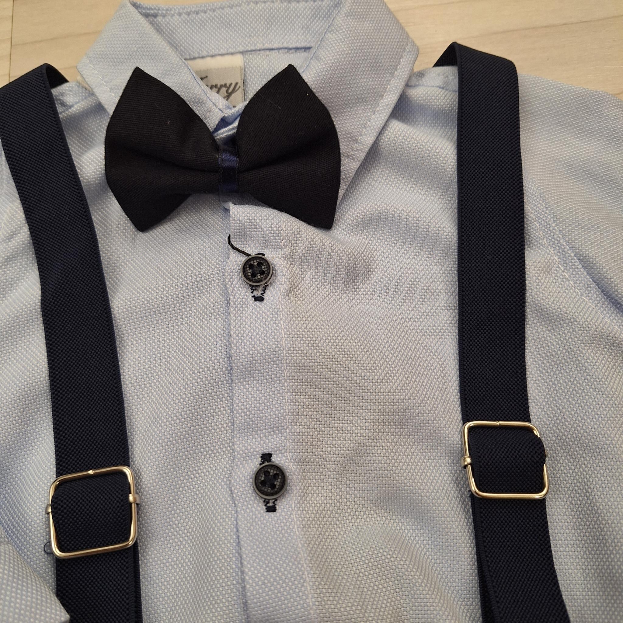 A sötétkék nadrágtartó és a csokornyakkendő teszi teljessé ezt a bájos, kisfiús alkalmi szettet. Ettől válik igazán ünnepivé és fotózásra is tökéletessé.