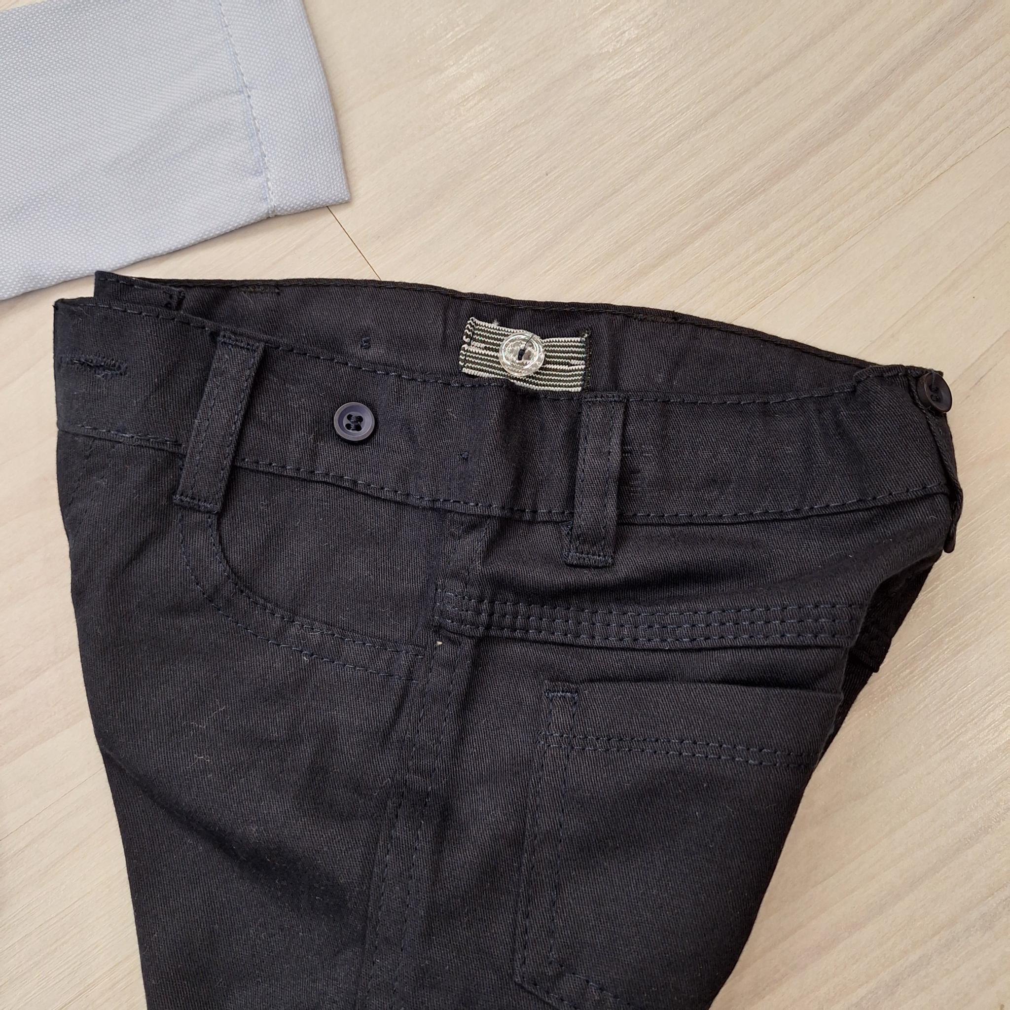 A sötétkék vászonnadrág klasszikus megjelenést kölcsönöz, miközben megőrzi a kényelmet. Elöl és hátul is két-két zsebbel rendelkezik, a belsejében pedig állítható gumis derékrész található, így tökéletesen igazítható a baba méretéhez.