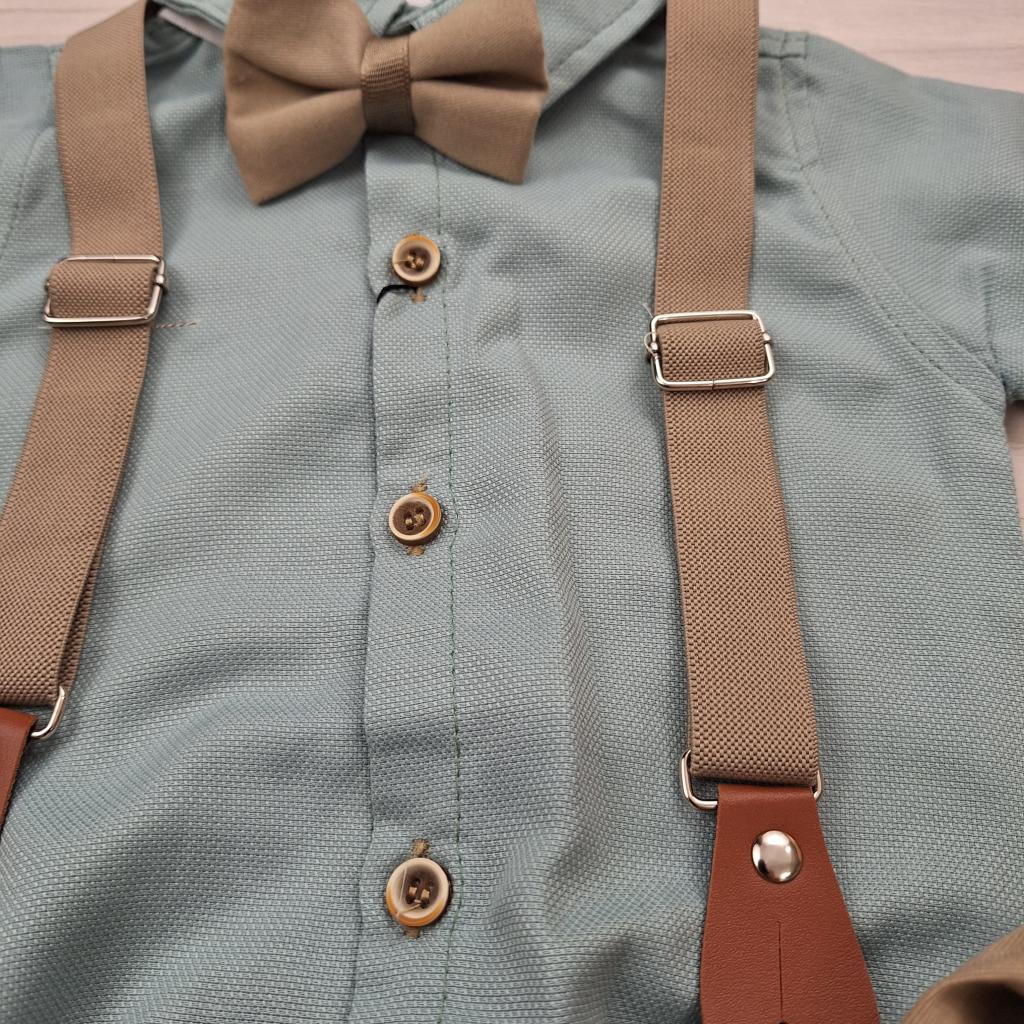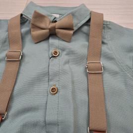 A bézs nadrágtartó és a bézs csokornyakkendő teszi teljessé ezt a bájos, kisfiús alkalmi szettet. Ettől válik igazán ünnepivé és fotózásra is tökéletessé.