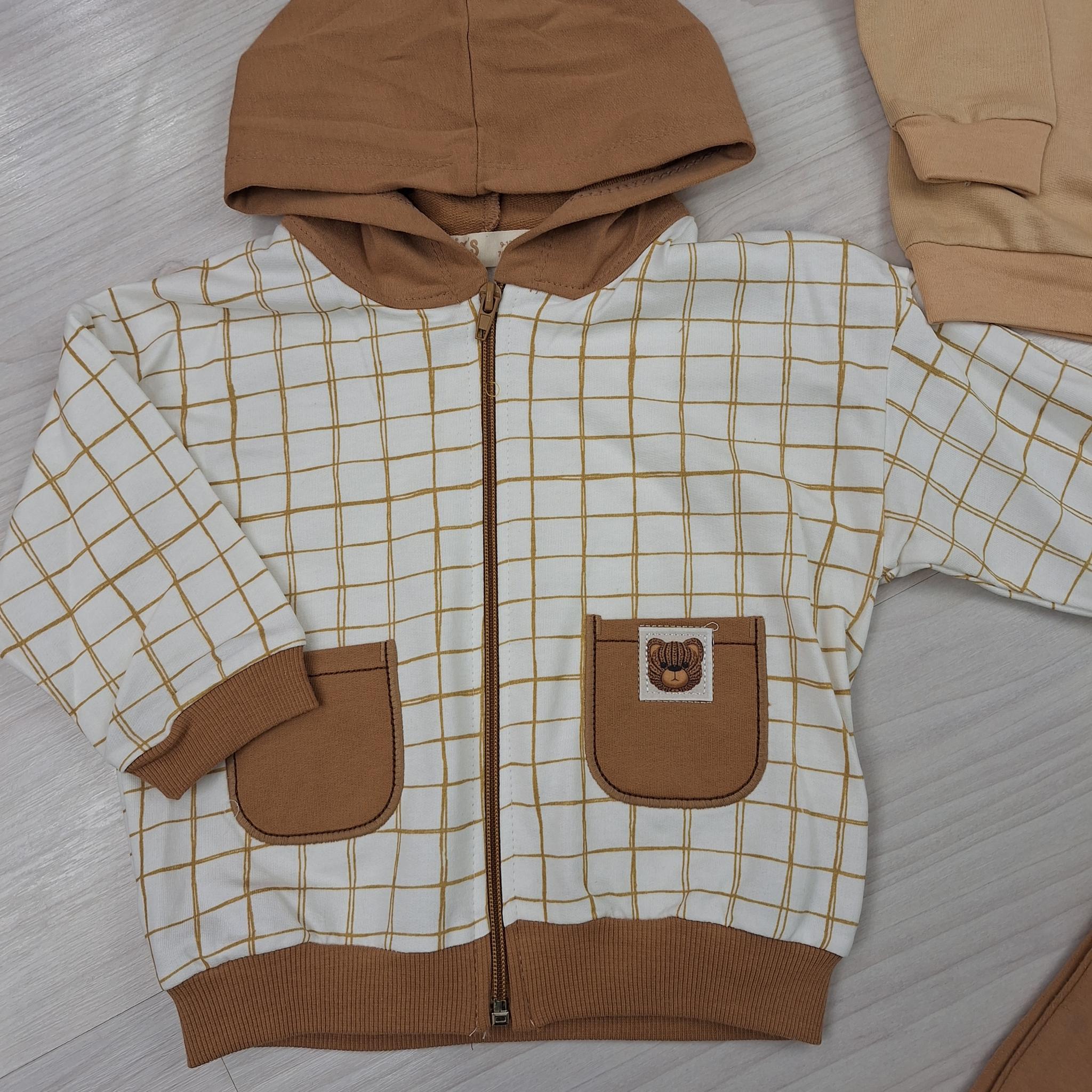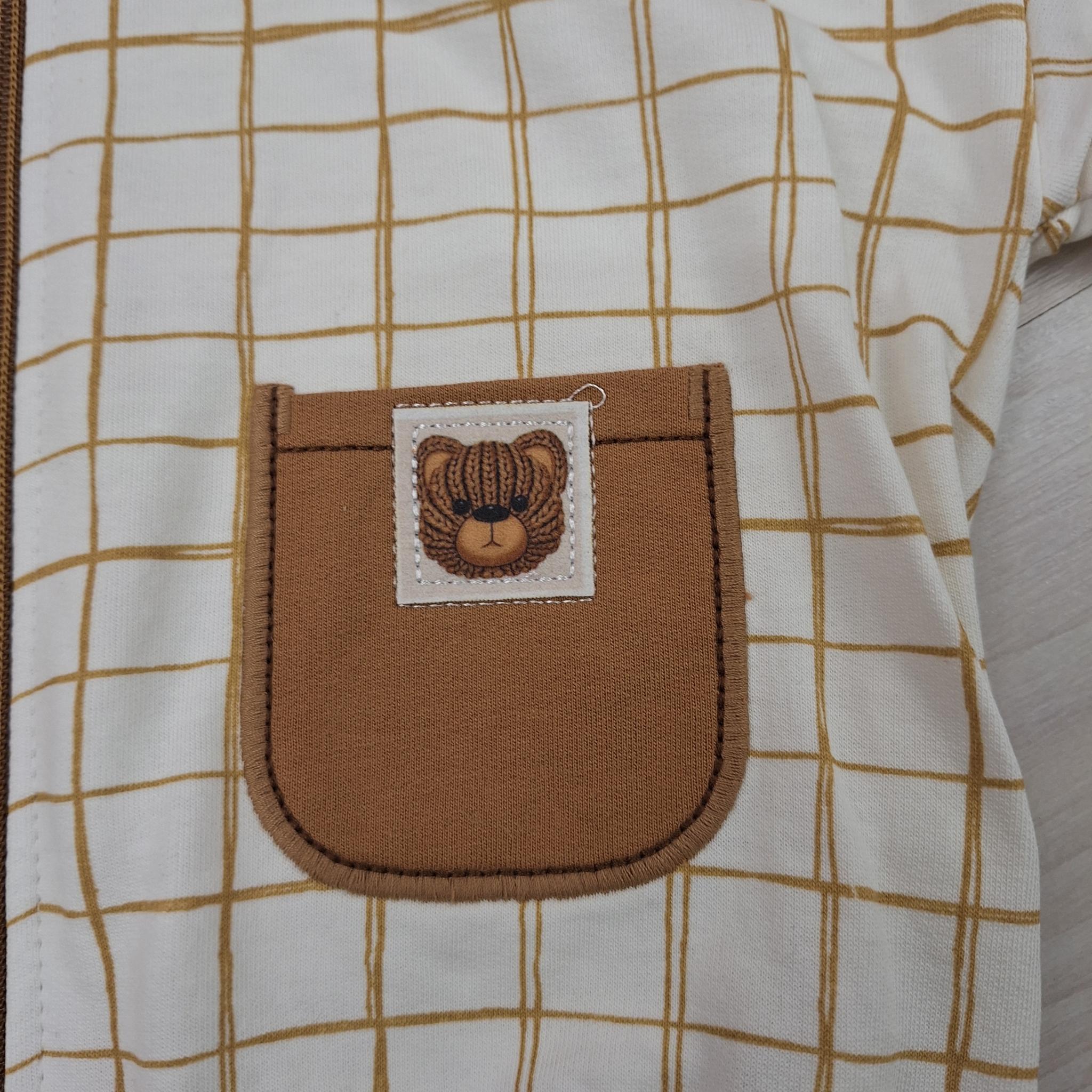 A pulóver fehér alapszíne barna rácsmintával díszített, két barna díszzseb található rajta, az egyik zseben pedig egy kedves kis maci minta díszeleg. A kapucni, valamint az ujjak és az alsó rész passzéi barna színűek, így tökéletesen harmonizálnak a nadrággal. Könnyed anyaga ideális átmeneti időben.