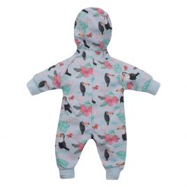 Az overál praktikus kapucnival van ellátva, szélesebb rugalmas szegéllyel a kezén és a lábszárán.