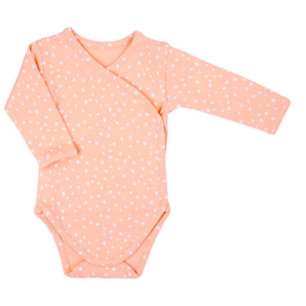 A body pöttyös mintázatú. Az öltöztetést és a pelenkacserét megkönnyítik az oldalrész teljes hosszában és a lábak között praktikusan összekapcsolható patentek.