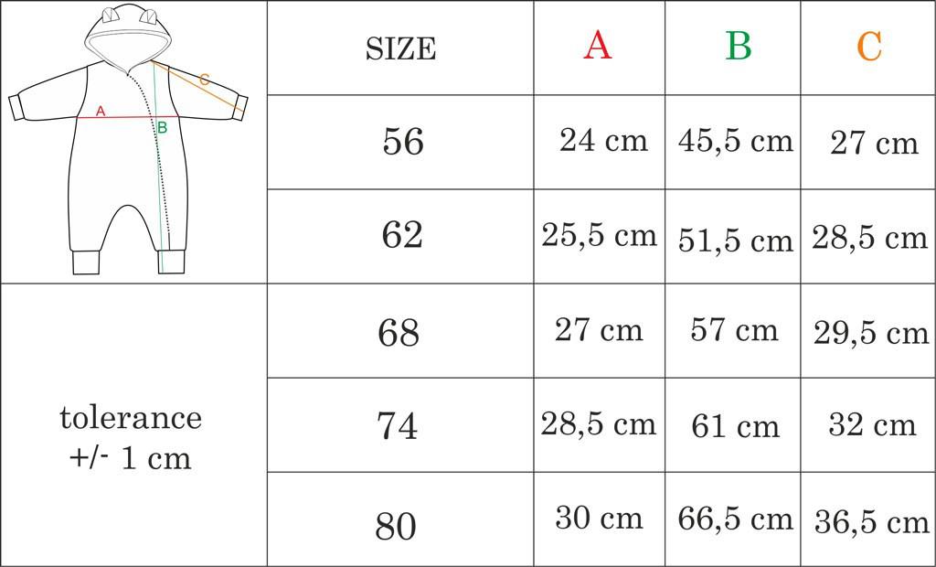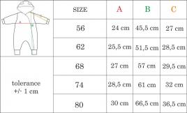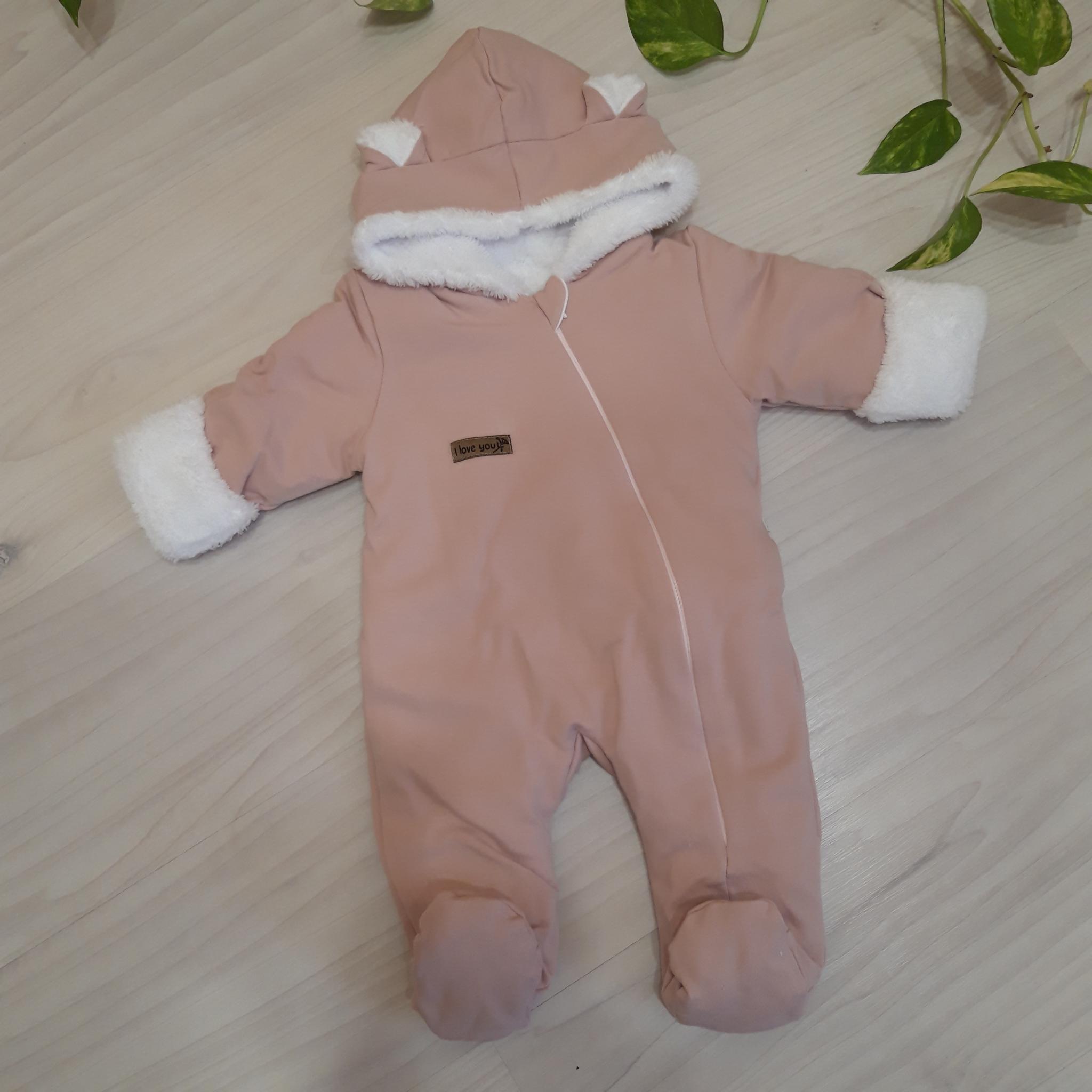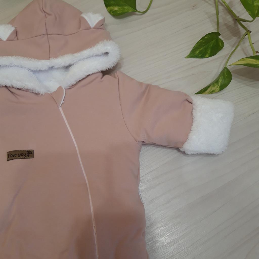 Az overál minőségi anyagból készül, amely garantálja a babának a meleget és kényelmet. Nagyon puha, kellemes tapintású , Wellsof anyaggal bélelt. Az ujjak felhajthatók, aminek köszönhetően láthatóvá válik a meleg bélés. A kezeslábas teljes hosszában az oldalán cipzáras.