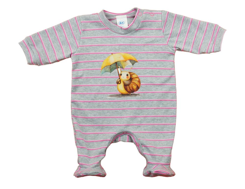 Praktikus és kényelmes viselet ez a csíkos alapayagól készült cuki mintával nyomott baba rugdalózó. Vállán patentos, így megkönnyíti a picik öltöztetését. A lába közötti patentos megoldás a peluscserénél nagy segítség Az egyik legjobb megoldás különösen újszülötteknél és az első néhány hónapban. Minőségi, 100% pamut bababarát anyagból készült, ami jól mosható, könnyen kezelhető.