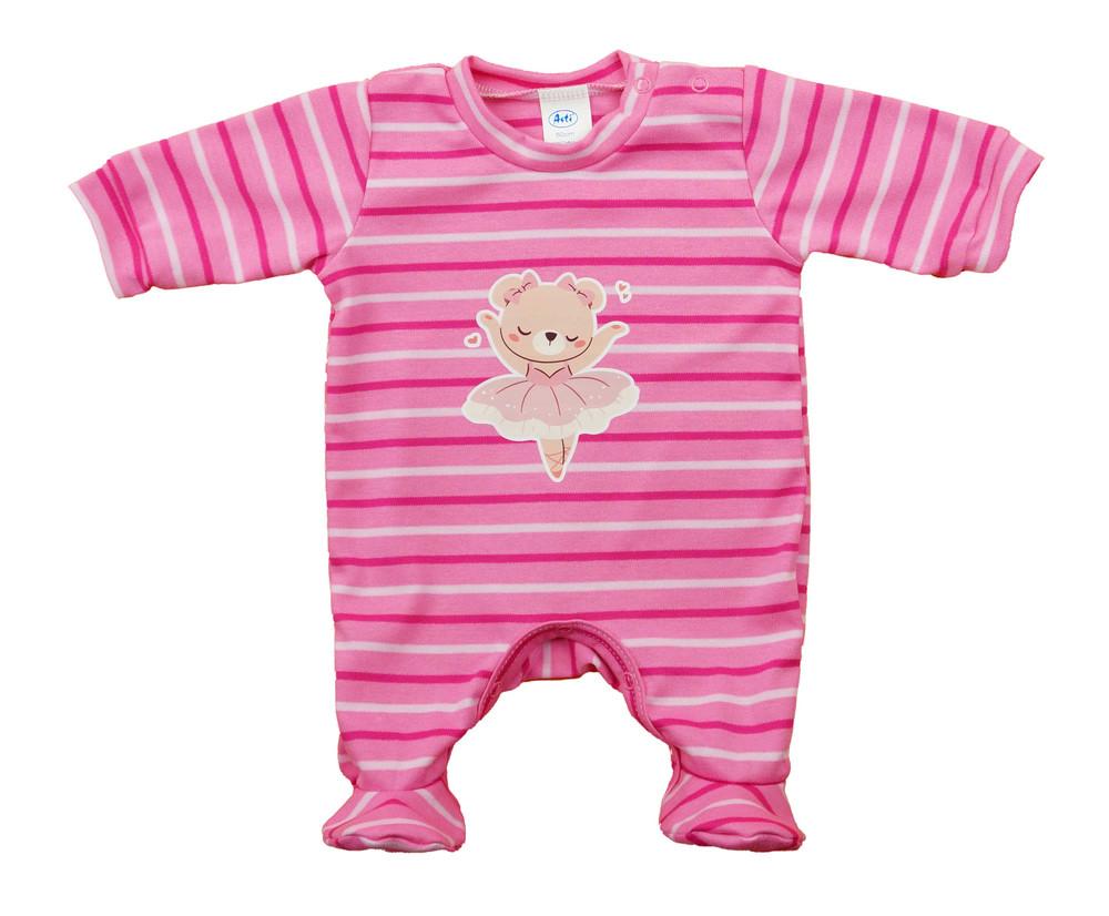 Praktikus és kényelmes viselet ez a csíkos alapayagól készült cuki mintával nyomott baba rugdalózó. Vállán patentos, így megkönnyíti a picik öltöztetését. A lába közötti patentos megoldás a peluscserénél nagy segítség Az egyik legjobb megoldás különösen újszülötteknél és az első néhány hónapban. Minőségi, 100% pamut bababarát anyagból készült, ami jól mosható, könnyen kezelhető.