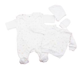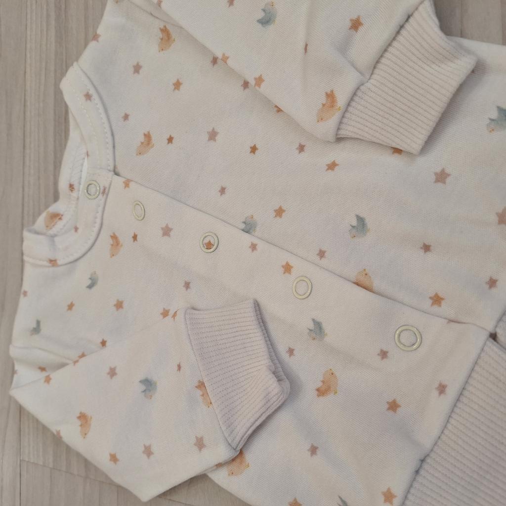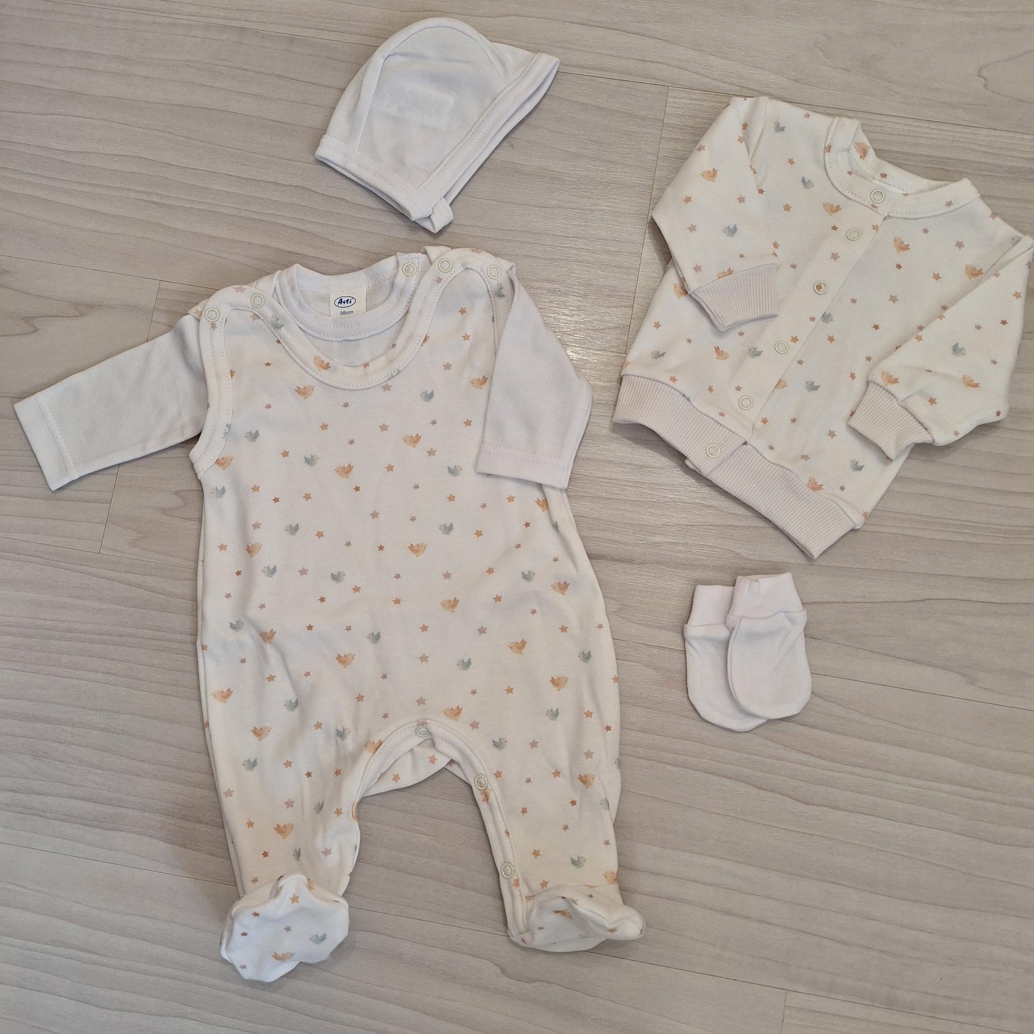 A csomag tartalmaz egy ujjatlan vállon patentos rugdalózót telenyomott madárkás mintával , hosszú ujjú, egyszínű ,vállon patentos baba bodyt és egy elöl patentos, telenyomott, madárka mintás baba kocsikabátot, ami tökéletes választás lesz a hűvösebb napokra. A csomagban található baba sapka és a baba kesztyű pedig hozzáadja az utolsó simításokat ehhez az kényelmes szetthez.