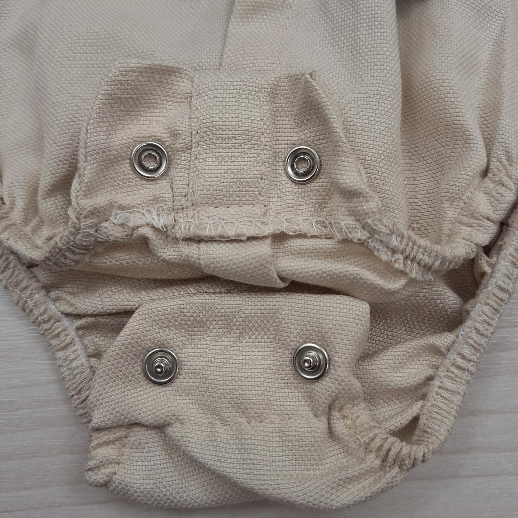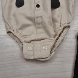A szett lelke egy bézs galléros, rövid ujjú baba body, amely elöl gombos kialakítású. Az ülepénél patentos záródással készült a könnyebb öltöztetés érdekében. Külön figyelmesség, hogy a body lábrészénél gumírozott szegély gondoskodik a kényelmes illeszkedésről.