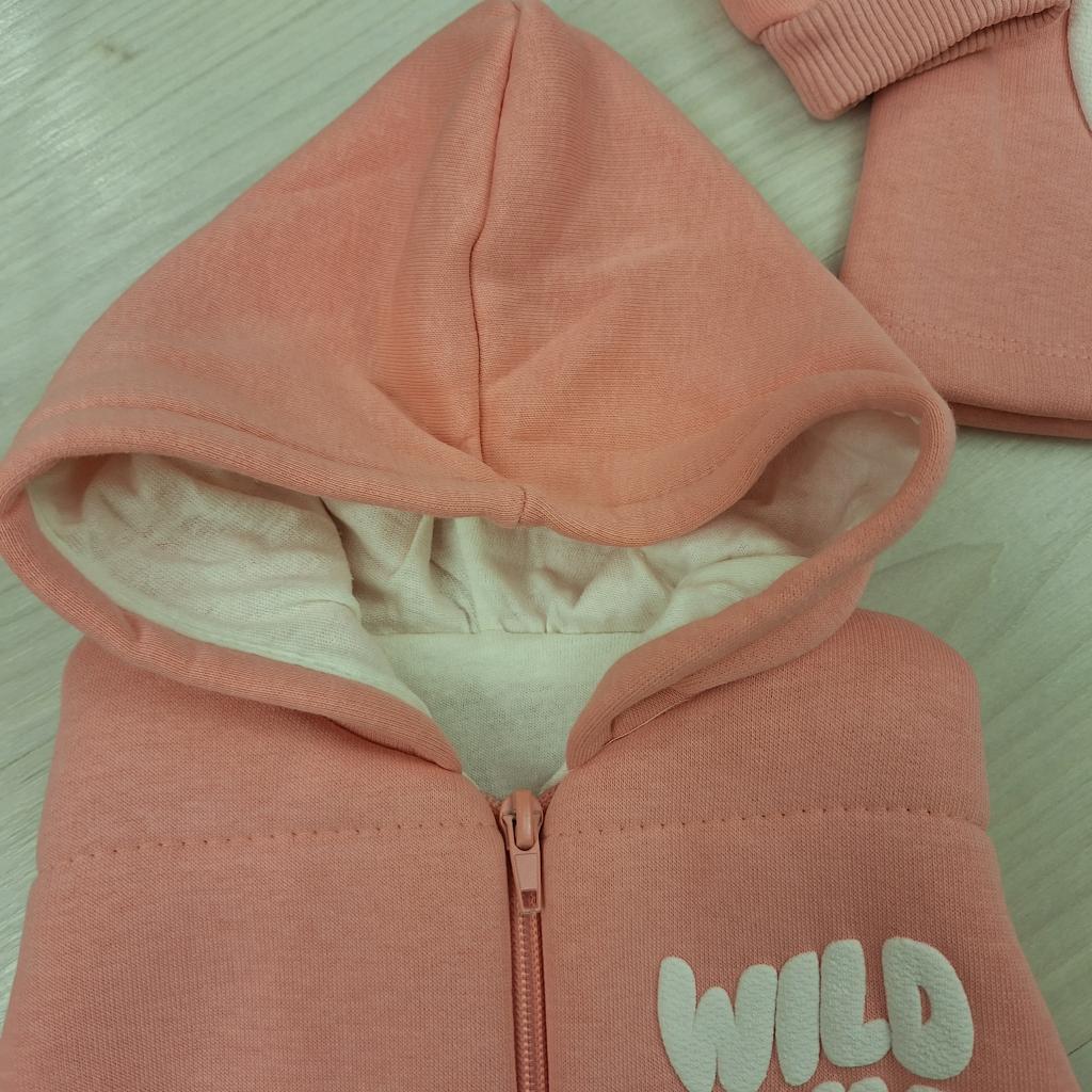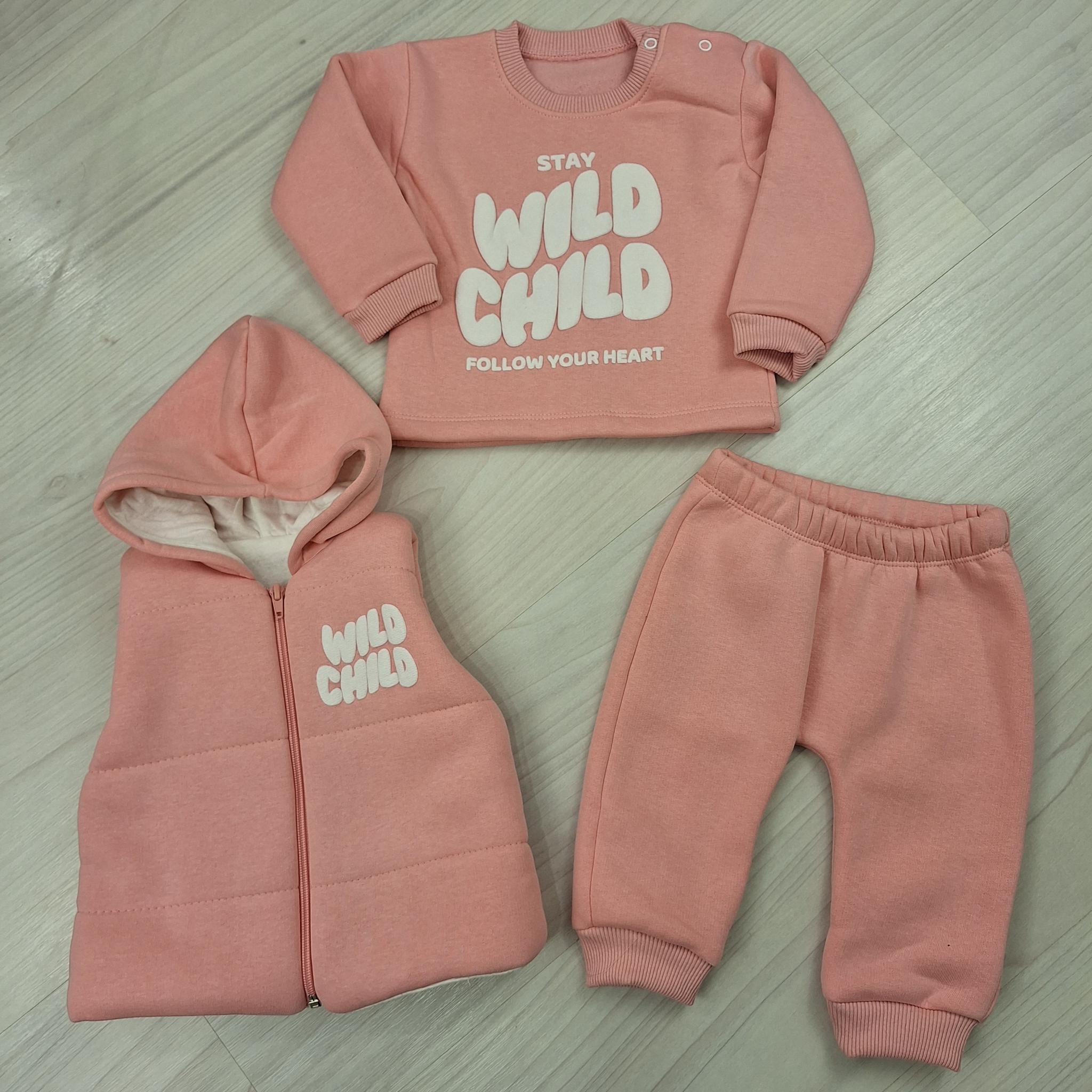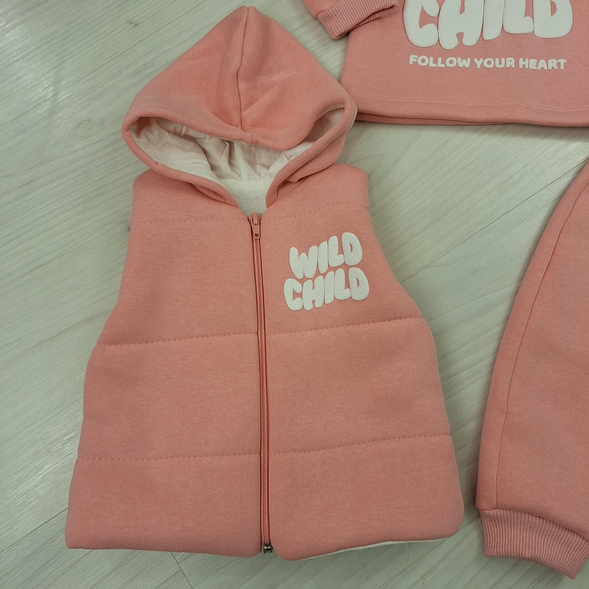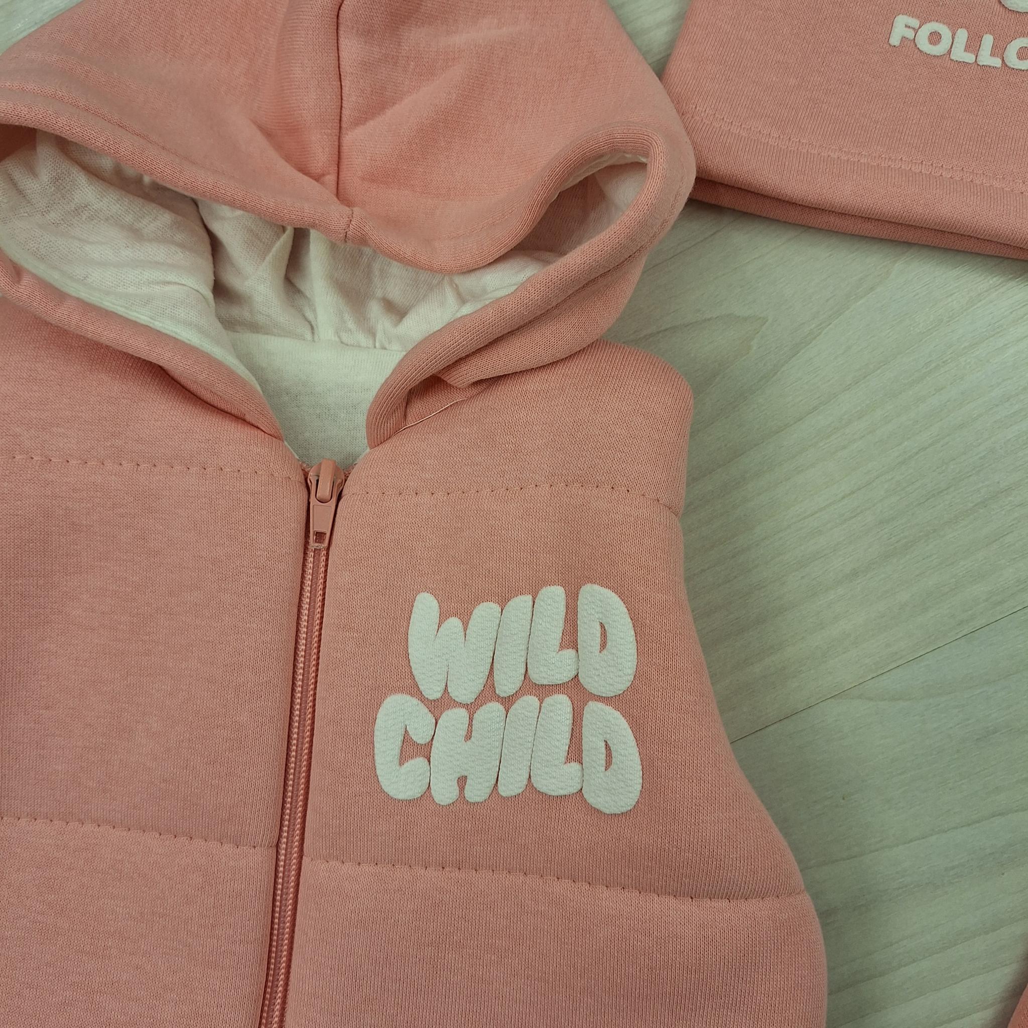 A mellény kívül rózsaszín, belül pedig egyszerű fehér anyaggal bélelt, közbéléssel kiegészítve a melegségért. Kapucnis kialakítása védi a fejet a hidegtől. A „Wild Child” felirat játékos és bájos, tökéletesen illik a szett stílusához.