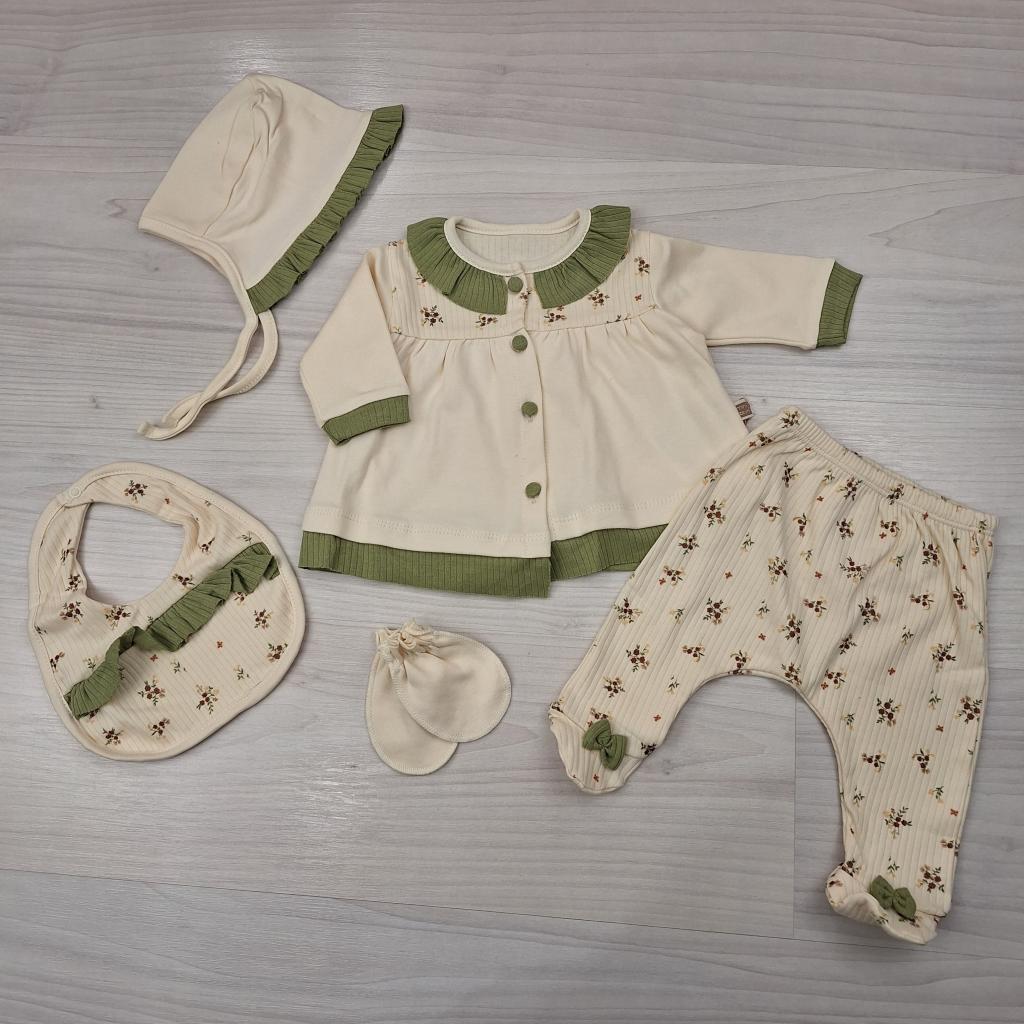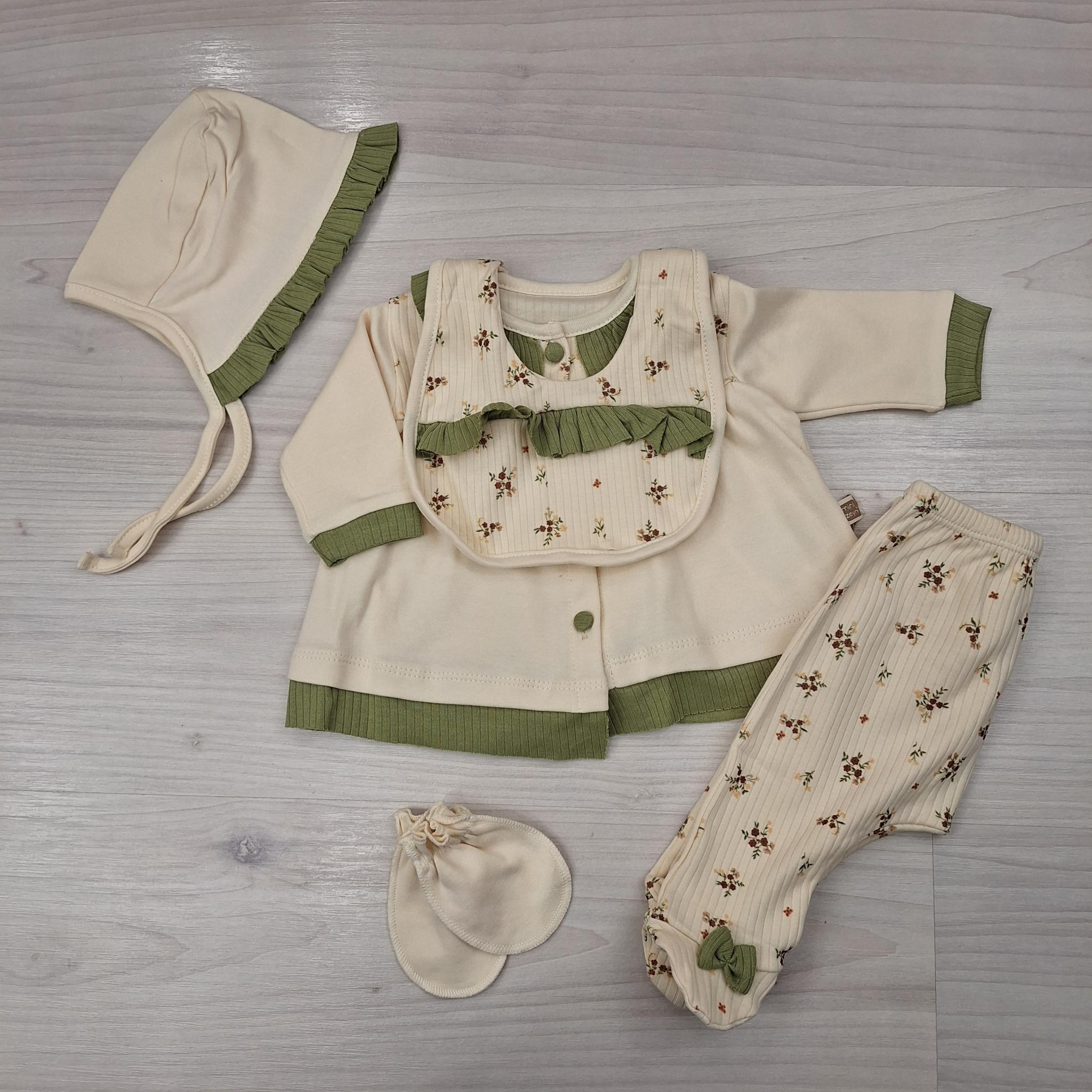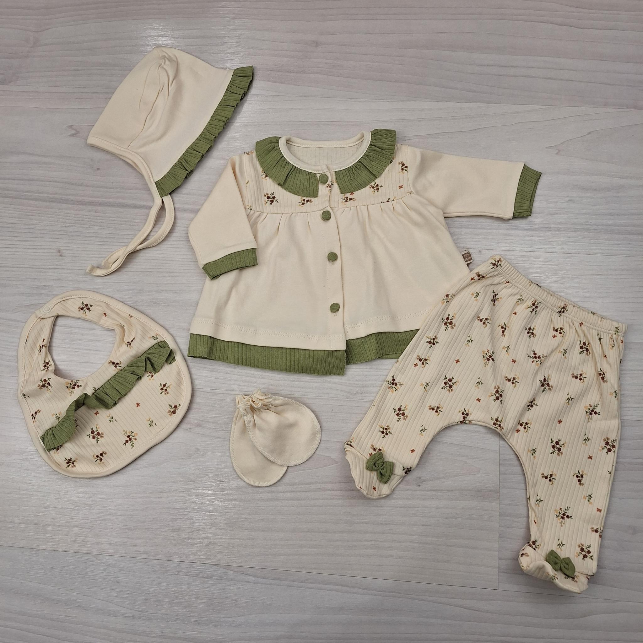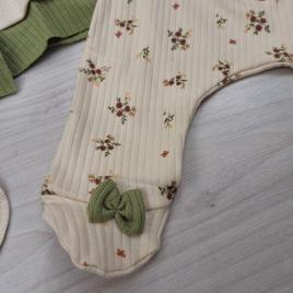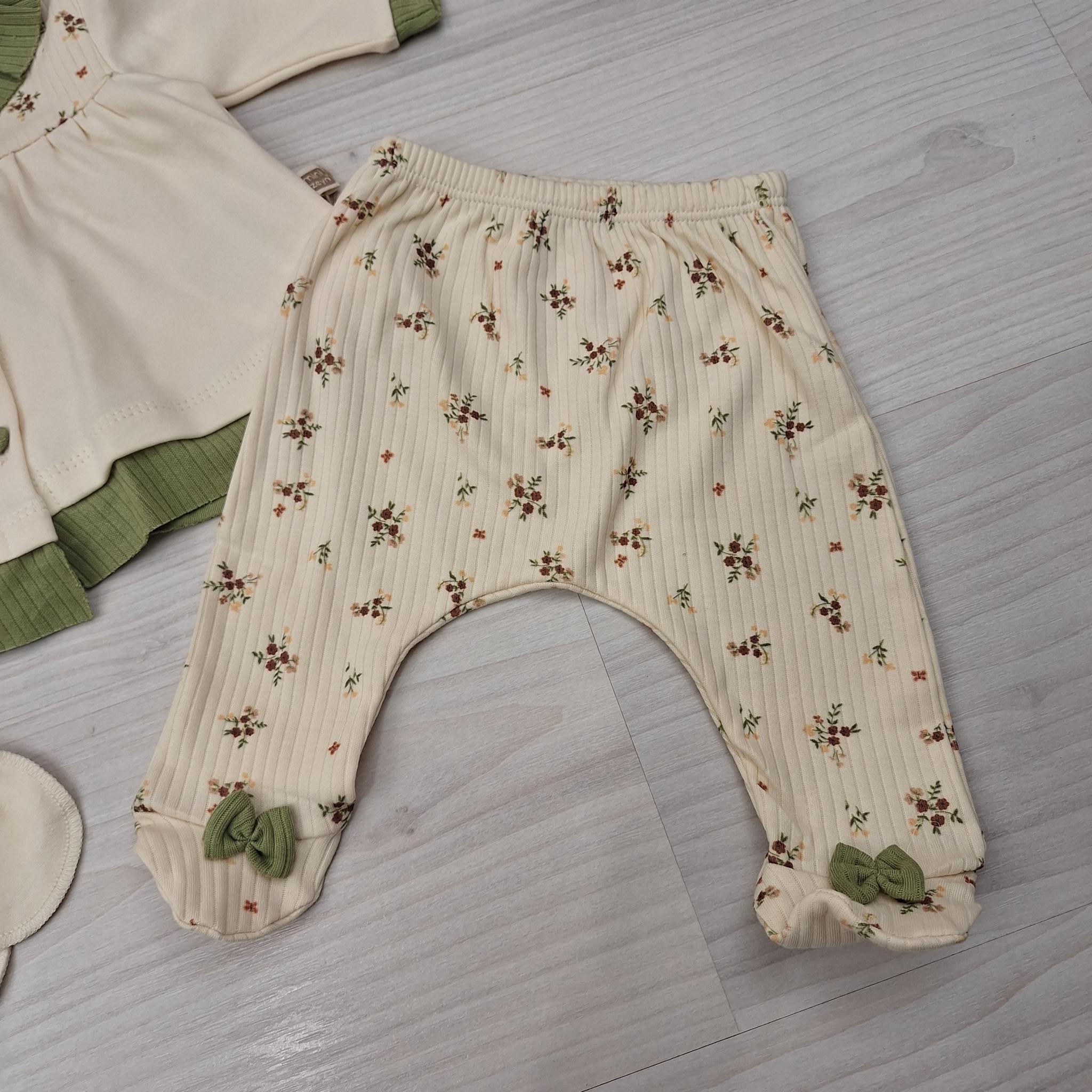 Ez a gyönyörűen összehangolt 5 részes újszülött szett kislányoknak igazán bájos megjelenést kölcsönöz. A krém alapszínt finom virágos minta, valamint aprólékos zöld díszítések teszik különlegessé, miközben a 100% pamut anyag maximális kényelmet biztosít az újszülöttek érzékeny bőrének.