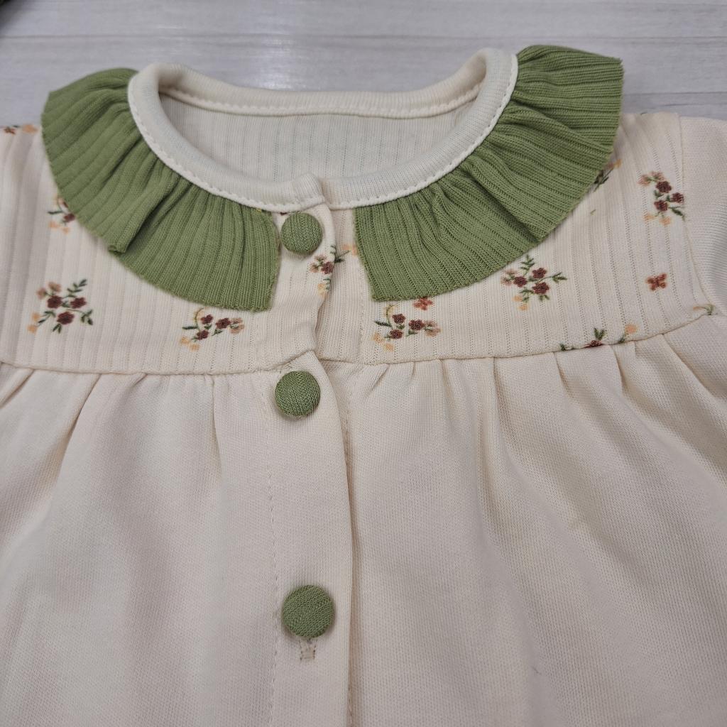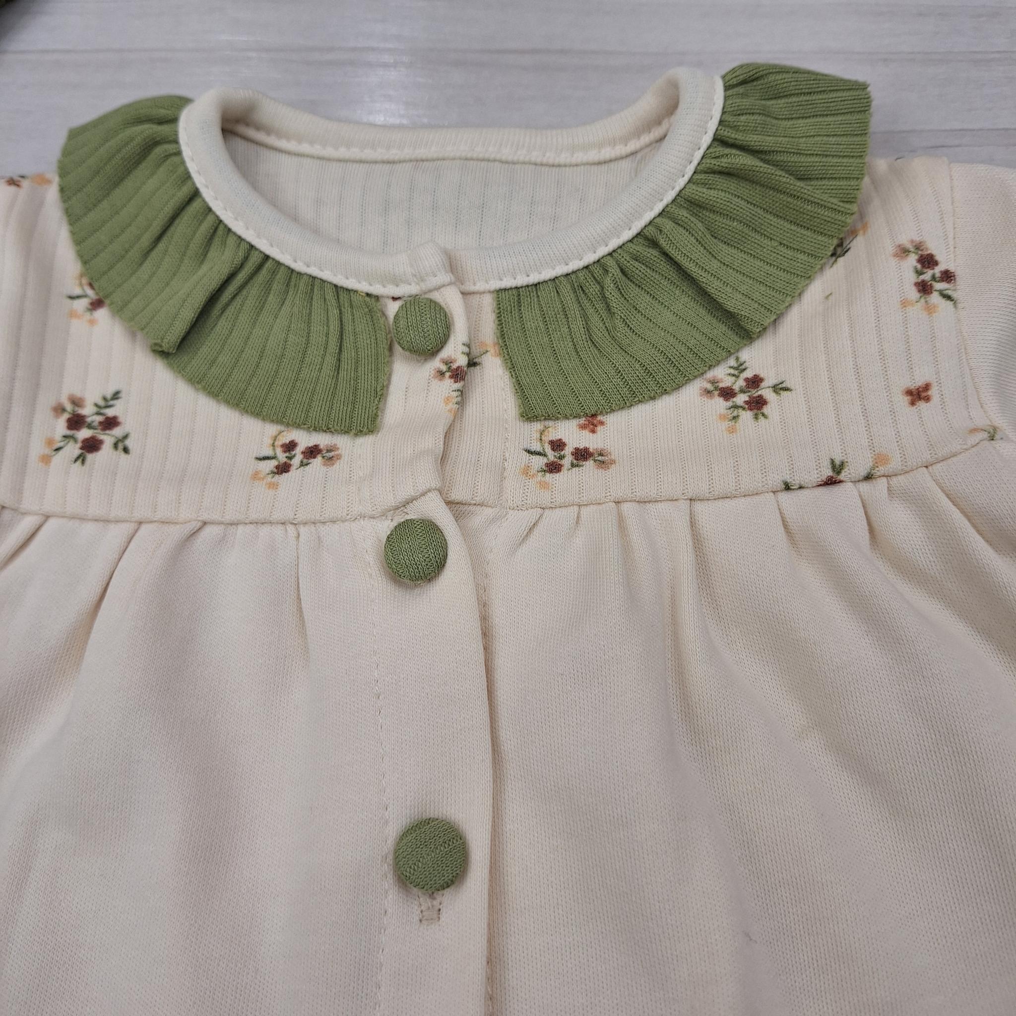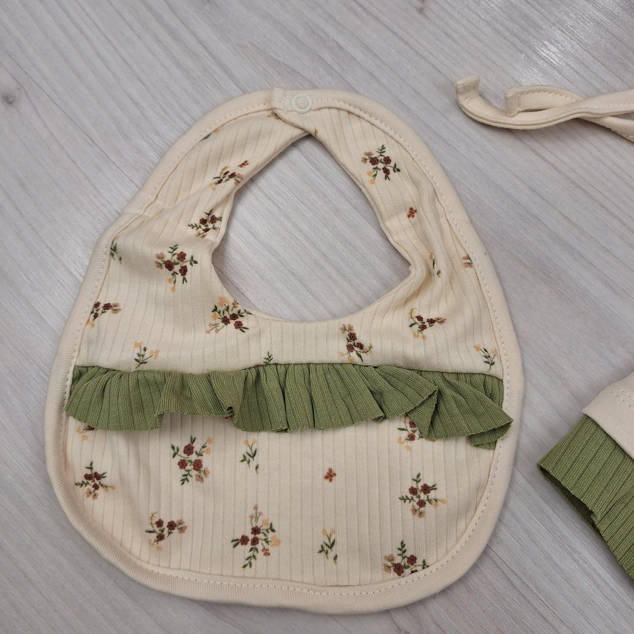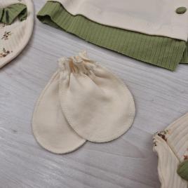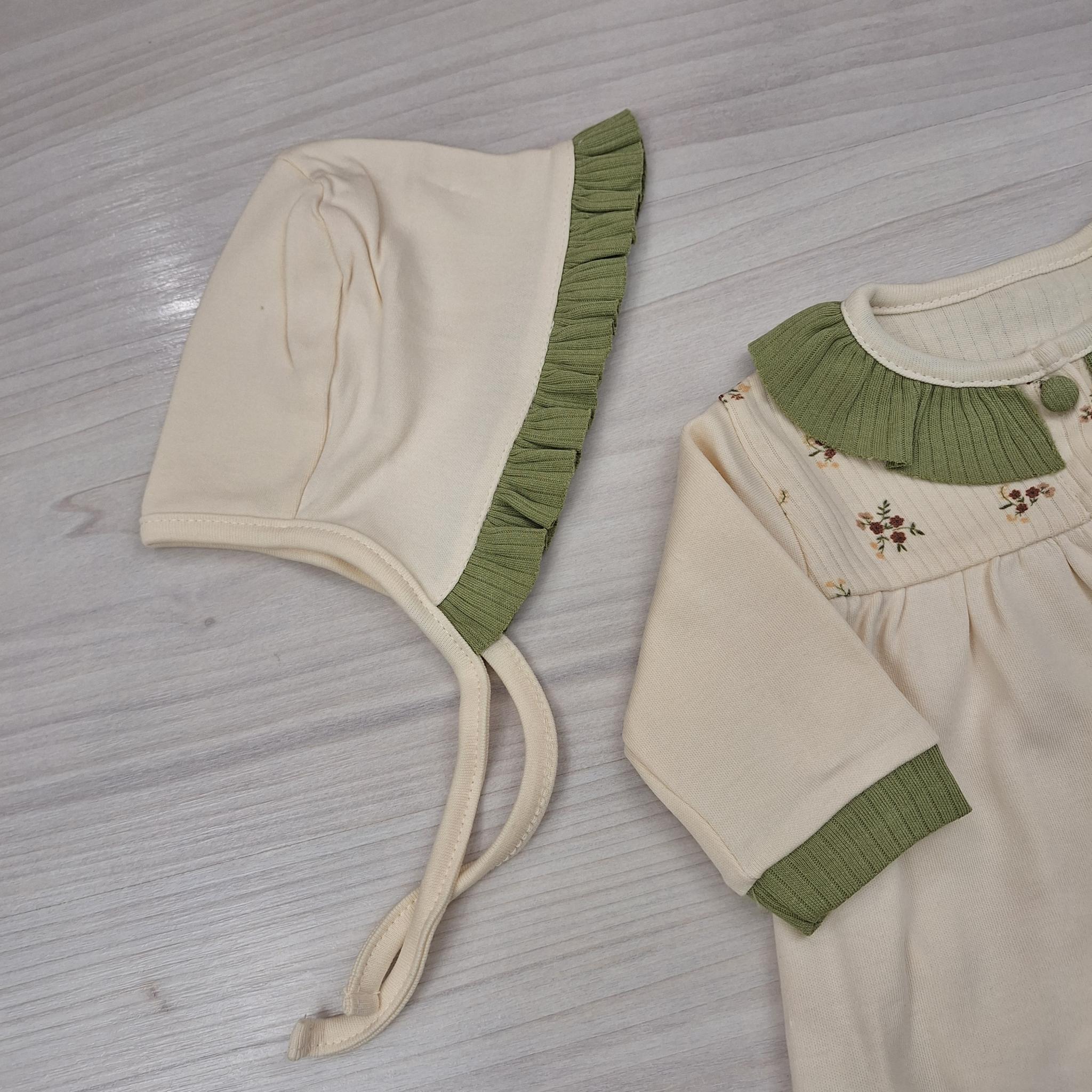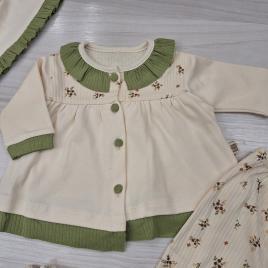 Ez a gyönyörűen összehangolt 5 részes újszülött szett kislányoknak igazán bájos megjelenést kölcsönöz. A krém alapszínt finom virágos minta, valamint aprólékos zöld díszítések teszik különlegessé, miközben a 100% pamut anyag maximális kényelmet biztosít az újszülöttek érzékeny bőrének.