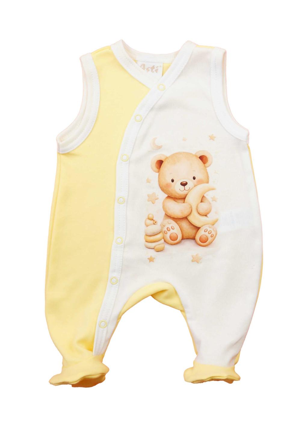 Vidám színben pompázó, ujjatlan rugdalózónk vidám mintával egészül ki, amely minden kisbaba gardróbja sztárja lesz! A vékony pamut anyagból készült rugdalózó ideális választás a melegebb napokra, hiszen kiválóan szellőzik és megfelelő komfortérzetet biztosít a baba bőrének. Kifejezetten minőségi magyar termékről van szó, ami garantáltan ellenálló és tartós lesz a sok mosás ellenére is.