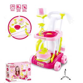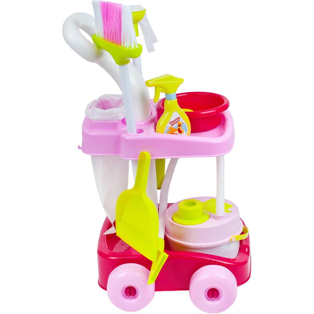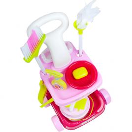 Gyönyörű gyermek takarítókocsi porszívóval. A porszívó puha tömlővel van felszerelve a kis polisztirol gyöngyök porszívózásához.